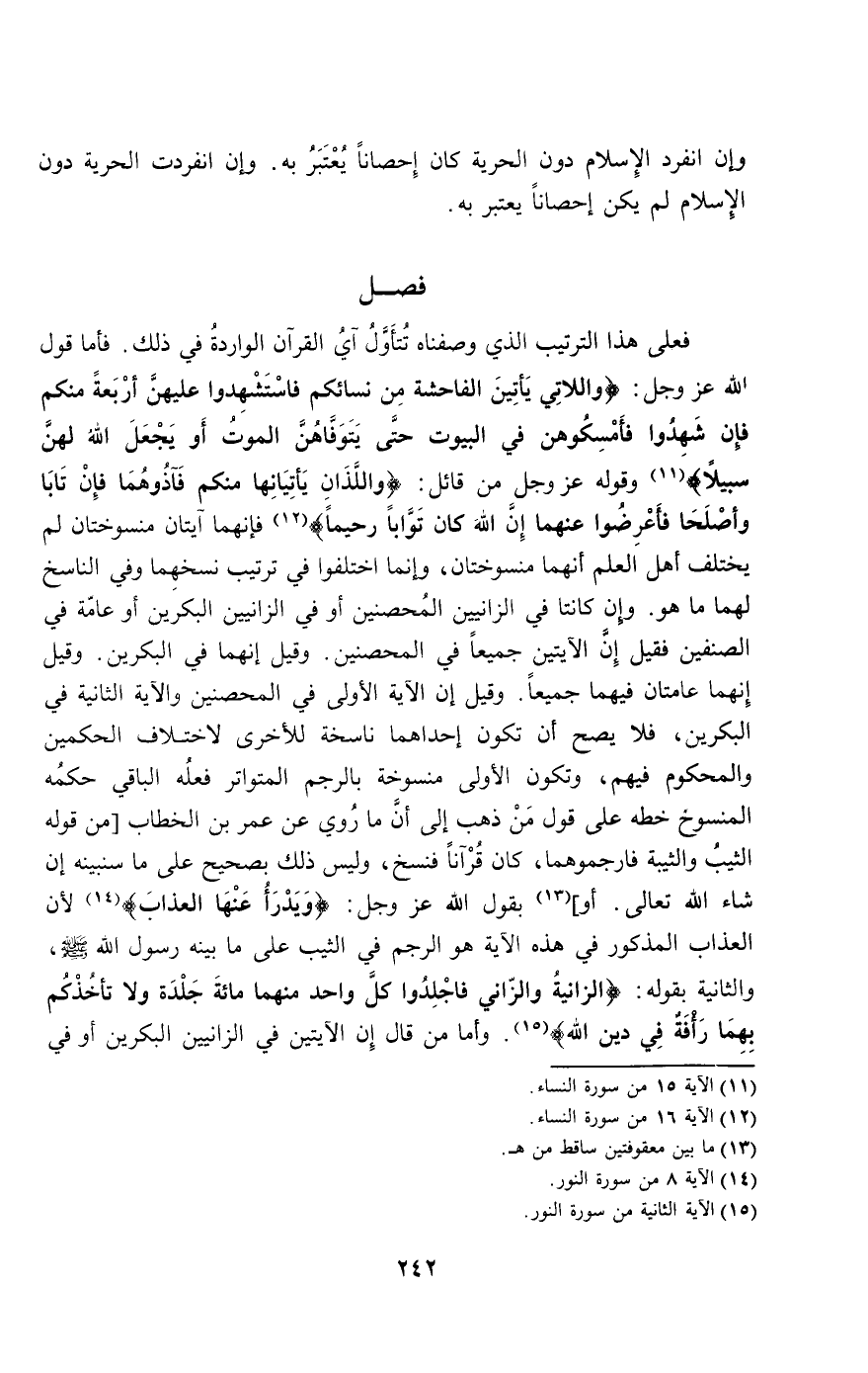 فعلى هذا الترتيب الذي وصفناه تُتَأَوَّل آيُ القرآن الواردة في ذلك. فأما قول الله عز وجل: {وَاللاتِي يَأْتِينَ الْفَاحِشَةَ مِنْ نِسَائِكُمْ فَاسْتَشْهِدُوا عَلَيْهِنَّ أَرْبَعَةً مِنْكُمْ فَإِنْ شَهِدُوا فَأَمْسِكُوهُنَّ فِي الْبُيُوتِ حَتَّى يَتَوَفَّاهُنَّ الْمَوْتُ أَوْ يَجْعَلَ اللَّهُ لَهُنَّ سَبِيلا} [النساء: 15] وقوله عز وجل من قائل: {وَاللَّذَانِ يَأْتِيَانِهَا مِنْكُمْ فَآذُوهُمَا فَإِنْ تَابَا وَأَصْلَحَا فَأَعْرِضُوا عَنْهُمَا إِنَّ اللَّهَ كَانَ تَوَّابًا رَحِيمًا} [النساء: 16] فإنهما آيتان منسوختان لم يختلف أهل العلم أنهما منسوختان، وإنما اختلفوا في ترتيب نسخهما وفي الناسخ لهما ما هو. وإن كانتا في الزانيين المحصنين أو في الزانيين البكرين أو عامة في الصنفين فقيل إن الآيتين جميعا في المحصنين. وقيل إنهما في البكرين. وقيل إنهما عامتان فيهما جميعا. وقيل إن الآية الأولى في المحصنين والآية الثانية في البكرين، فلا يصح أن تكون إحداهما ناسخة للأخرى لاختلاف الحكمين والمحكوم فيهم، وتكون الأولى منسوخة بالرجم المتواتر فعلُه الباقي حكمه المنسوخ خطه على قول من ذهب إلى أن ما روي عن عمر بن الخطاب بقول الله عز وجل: {وَيَدْرَأُ عَنْهَا الْعَذَابَ} [النور: 8] لأن العذاب المذكور في هذه الآية هو الرجم في الثيب على ما بينه رسول الله - صَلَّى اللَّهُ عَلَيْهِ وَسَلَّمَ -، والثانية بقوله: {الزَّانِيَةُ وَالزَّانِي فَاجْلِدُوا كُلَّ وَاحِدٍ مِنْهُمَا مِائَةَ جَلْدَةٍ وَلا تَأْخُذْكُمْ بِهِمَا رَأْفَةٌ فِي دِينِ اللَّهِ} [النور: 2]. وأما من قال إن الآيتين في الزانيين البكرين أو في