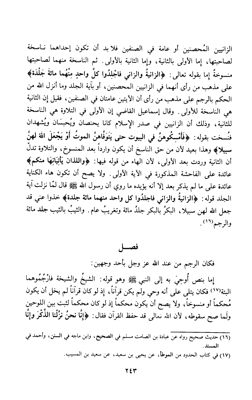 إما بنص أوحي به إلى النبي - صَلَّى اللَّهُ عَلَيْهِ وَسَلَّمَ - وهو قوله: الشيخ والشيخة فارجموهما البتة فكان يتلى على أنه وحي ولم يكن قرآنا، إذ لو كان قرآنا لم يخل أن يكون محكما أو منسوخا، ولا يصح أن يكون محكما إذ لو كان محكما لثبت بين اللوحين ولما صح سقوطه، لأن الله تعالى قد حفظ القرآن فقال: {إِنَّا نَحْنُ نَزَّلْنَا الذِّكْرَ وَإِنَّا لَهُ لَحَافِظُونَ} [الحجر: 9].