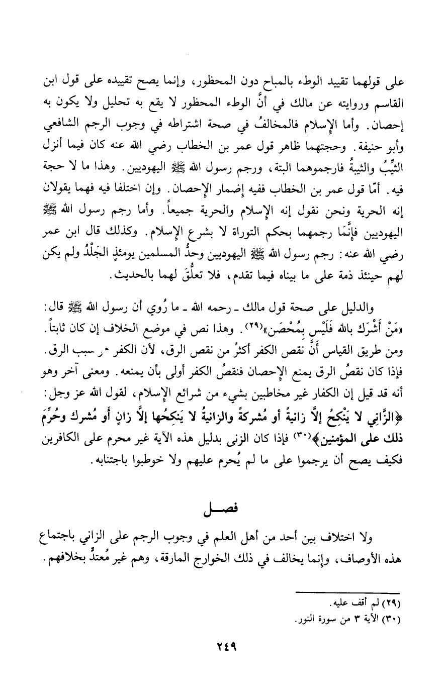على قولهما تقييد الوطء بالمباح دون المحظور، وإنما يصح تقييده على قول ابن القاسم وروايته عن مالك في أن الوطء المحظور لا يقع به تحليل ولا يكون به إحصان. وأما الإسلام فالمخالف في صحة اشتراطه في وجوب الرجم الشافعي وأبو حنيفة. وحجتهما ظاهر قول عمر بن الخطاب - رَضِيَ اللَّهُ عَنْهُ - كان فيما أنزل الثيب والثيبة فارجموهما البتة، ورجم رسول الله - صَلَّى اللَّهُ عَلَيْهِ وَسَلَّمَ - اليهوديين. وهذا ما لا حجة فيه. أما قول عمر بن الخطاب ففيه إضمار الإحصان. وإن اختلفا فيه فهما يقولان إنه الحرية ونحن نقول إنه الإسلام والحرية جميعا. وأما رجم رسول الله - صَلَّى اللَّهُ عَلَيْهِ وَسَلَّمَ - اليهوديين فإنما رجمهما بحكم التوراة لا بشرع الإسلام. وكذلك قال ابن عمر رضي الله عنه: «رجم رسول الله - صَلَّى اللَّهُ عَلَيْهِ وَسَلَّمَ - اليهوديين وحد المسلمين يومئذ الجلد ولم يكن لهم حينئذ ذمة» على ما بيناه فيما تقدم، فلا تعلق لهما بالحديث.