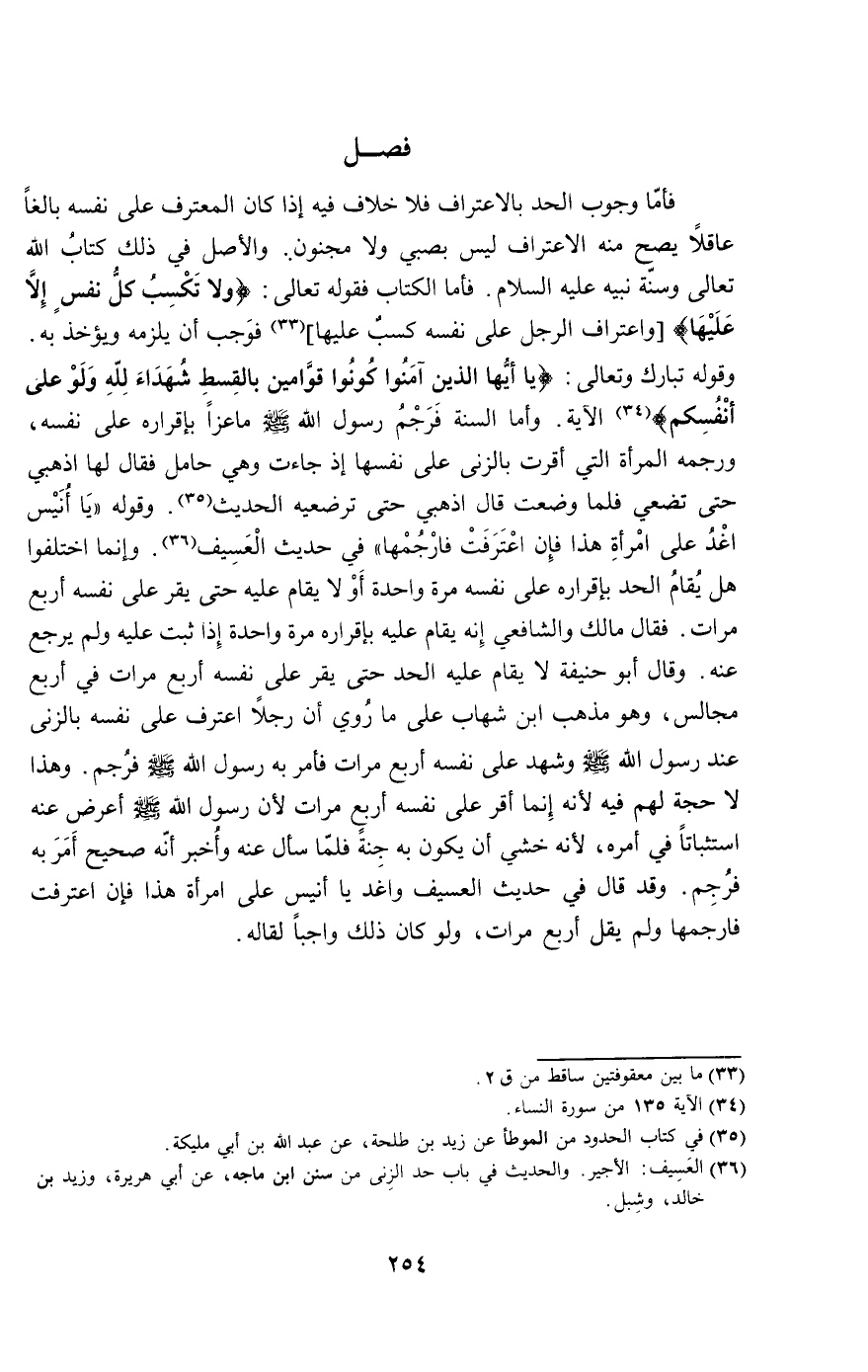 فأما وجوب الحد بالاعتراف فلا خلاف فيه إذا كان المعترف على نفسه بالغا عاقلا يصح منه الاعتراف ليس بصبي ولا مجنون. والأصل في ذلك كتاب الله تعالى وسنة نبيه - عَلَيْهِ السَّلَامُ -. فأما الكتاب فقوله تعالى: {وَلا تَكْسِبُ كُلُّ نَفْسٍ إِلا عَلَيْهَا} [الأنعام: 164] فوجب أن يلزمه ويؤخذ به. وقوله تبارك وتعالى: {يَا أَيُّهَا الَّذِينَ آمَنُوا كُونُوا قَوَّامِينَ بِالْقِسْطِ شُهَدَاءَ لِلَّهِ وَلَوْ عَلَى أَنْفُسِكُمْ} [النساء: 135] الآية. وأما السنة «فرجم رسول الله - صَلَّى اللَّهُ عَلَيْهِ وَسَلَّمَ - ماعزا بإقراره على نفسه» «ورجمه المرأة التي أقرت بالزنى على نفسها إذ جاءت وهي حامل فقال لها: اذهبي حتى تضعي فلما وضعت قال: اذهبي حتى ترضعيه» الحديث. وقوله «يا أنيس اغدُ على امرأة هذا فإن اعترفت فارجمها» في حديث العسيف. وإنما اختلفوا هل يقام الحد بإقراره على نفسه مرة واحدة أو لا يقام عليه حتى يقر على نفسه أربع مرات. فقال مالك والشافعي إنه يقام عليه بإقراره مرة واحدة إذا ثبت عليه ولم يرجع عنه. وقال أبو حنيفة لا يقام عليه الحد حتى يقر على نفسه أربع مرات في أربع مجالس، وهو مذهب ابن شهاب على ما روي «أن رجلا اعترف على نفسه بالزنى عند رسول الله - صَلَّى اللَّهُ عَلَيْهِ وَسَلَّمَ - وشهد على نفسه أربع مرات فأمر به رسول الله - صَلَّى اللَّهُ عَلَيْهِ وَسَلَّمَ - فرجم». وهذا لا حجة لهم فيه لأنه إنما أقر على نفسه أربع مرات لأن رسول الله - صَلَّى اللَّهُ عَلَيْهِ وَسَلَّمَ - أعرض عنه استثباتا في أمره، لأنه خشي أن يكون به جنة فلما سأل عنه وأخبر أنه صحيح أمر به فرجم. وقد قال في حديث العسيف «واغد يا أنيس على امرأة هذا فإن اعترفت فارجمها» ولم يقل أربع مرات، ولو كان ذلك واجبا لقاله.