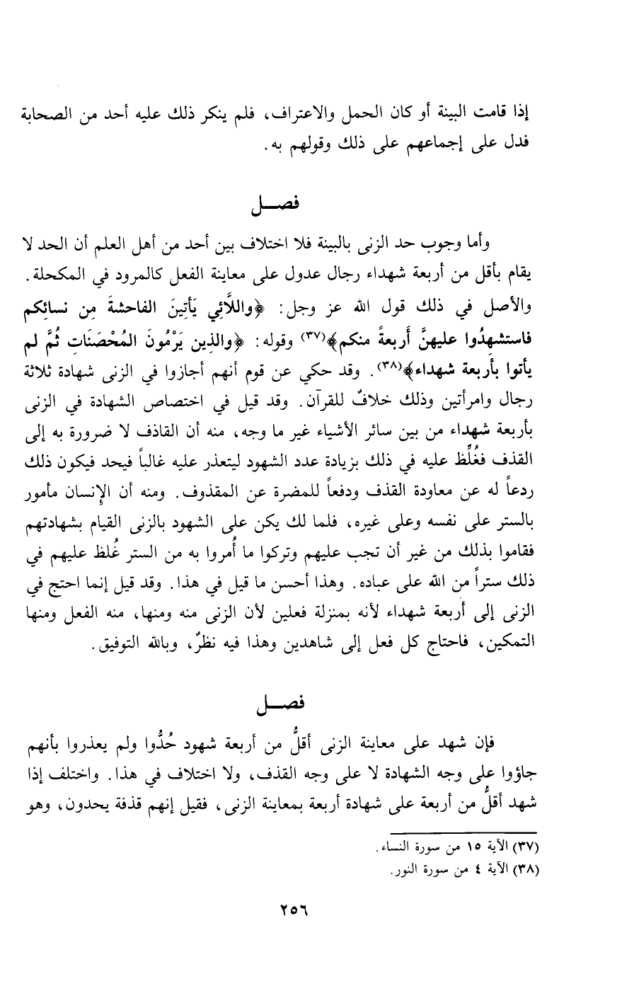 وأما وجوب حد الزنى بالبينة فلا اختلاف بين أحد من أهل العلم أن الحد لا يقام بأقل من أربعة شهداء رجال عدول على معاينة الفعل كالمرود في المكحلة. والأصل في ذلك قول الله عز وجل: {وَاللاتِي يَأْتِينَ الْفَاحِشَةَ مِنْ نِسَائِكُمْ فَاسْتَشْهِدُوا عَلَيْهِنَّ أَرْبَعَةً مِنْكُمْ} [النساء: 15] وقوله: {وَالَّذِينَ يَرْمُونَ الْمُحْصَنَاتِ ثُمَّ لَمْ يَأْتُوا بِأَرْبَعَةِ شُهَدَاءَ} [النور: 4]. وقد حكي عن قوم أنهم أجازوا في الزنى شهادة ثلاثة رجال وامرأتين وذلك خلاف للقرآن. وقد قيل في اختصاص الشهادة في الزنى بأربعة شهداء من بين سائر الأشياء غير ما وجه، منه أن القاذف لا ضرورة به إلى القذف فغلظ عليه في ذلك بزيادة عدد الشهود ليتعذر عليه غالبا فيحد فيكون ذلك ردعا له عن معاودة القذف ودفعا للمضرة عن المقذوف. ومنه أن الإنسان مأمور بالستر على نفسه وعلى غيره، فلما لم يكن على الشهود بالزنى القيام بشهادتهم فقاموا بذلك من غير أن تجب عليهم وتركوا ما أمروا به من الستر غلظ عليهم في ذلك سترا من الله على عباده. وهذا أحسن ما قيل في هذا. وقد قيل إنما احتج في الزنى إلى أربعة شهداء لأنه بمنزلة فعلين لأن الزنى منه ومنها، منه الفعل ومنها التمكين، فاحتاج كل فعل إلى شاهدين وهذا فيه نظر، وبالله التوفيق.