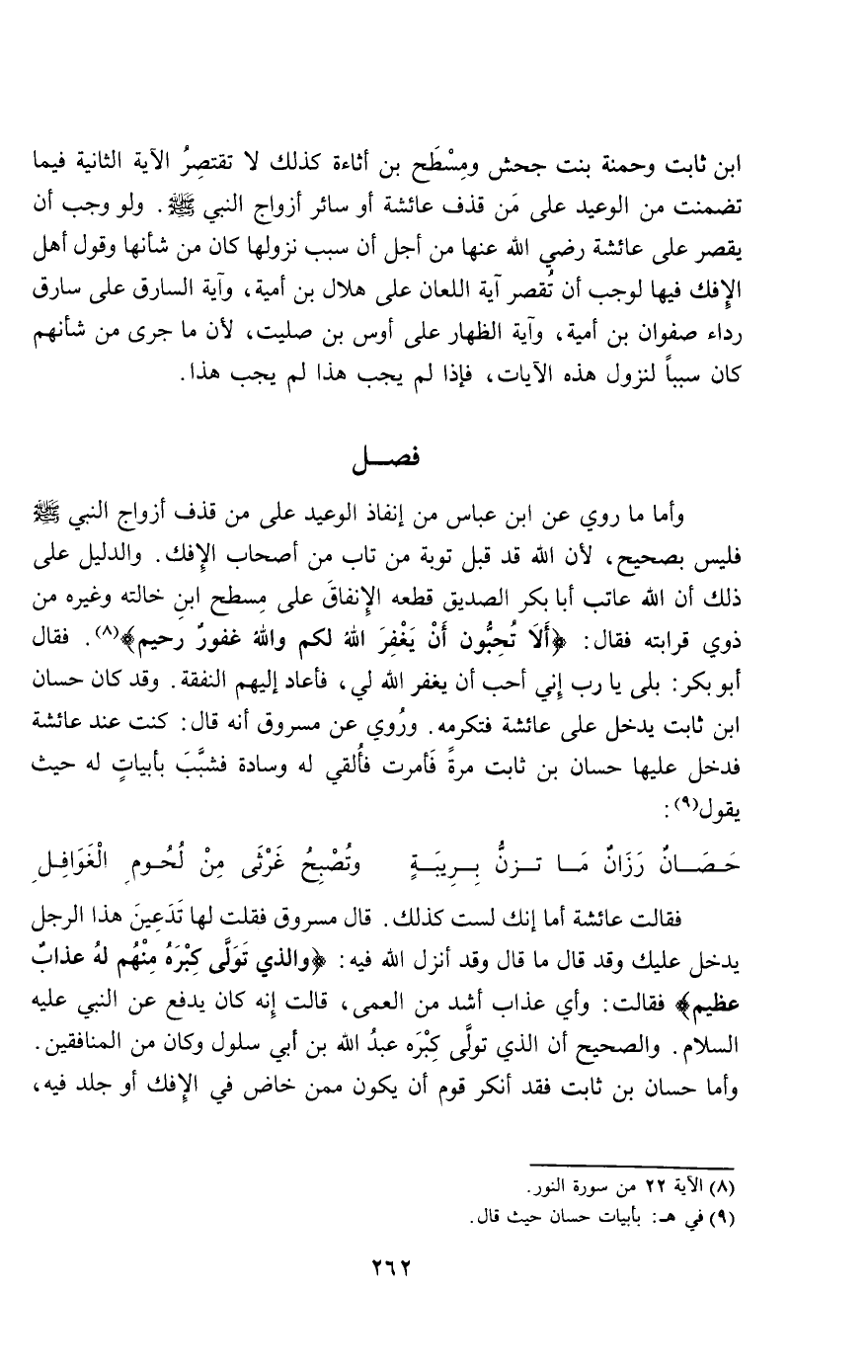 وأما ما روي عن ابن عباس من إنفاذ الوعيد على من قذف أزواج النبي - صَلَّى اللَّهُ عَلَيْهِ وَسَلَّمَ - فليس بصحيح، لأن الله قد قبل توبة من تاب من أصحاب الإفك. والدليل على ذلك أن الله عاتب أبا بكر الصديق قطعه الإنفاق على مسطح ابن خالته وغيره من ذوي قرابته فقال: {أَلا تُحِبُّونَ أَنْ يَغْفِرَ اللَّهُ لَكُمْ وَاللَّهُ غَفُورٌ رَحِيمٌ} [النور: 22]. فقال أبو بكر: بلى يا رب إني أحب أن يغفر الله لي، فأعاد إليهم النفقة. وقد كان حسان ابن ثابت يدخل على عائشة فتكرمه. وروي عن مسروق أنه قال: كنت عند عائشة فدخل عليها حسان بن ثابت مرة فأمرت فألقي له وسادة فشبب بأبيات له حيث يقول:
