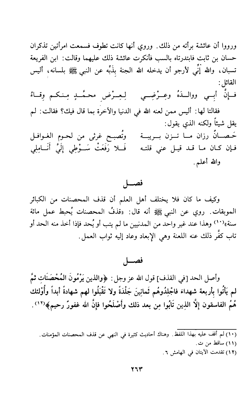 ورووا أن عائشة برأته من ذلك. وروي أنها كانت تطوف فسمعت امرأتين تذكران حسان بن ثابت فابتدرتاه بالسب فأنكرت عائشة ذلك عليهما وقالت: ابن الفريعة تسبان، والله إني لأرجو أن يدخله الله الجنة بذبه عن النبي - صَلَّى اللَّهُ عَلَيْهِ وَسَلَّمَ - بلسانه، أليس القائل: