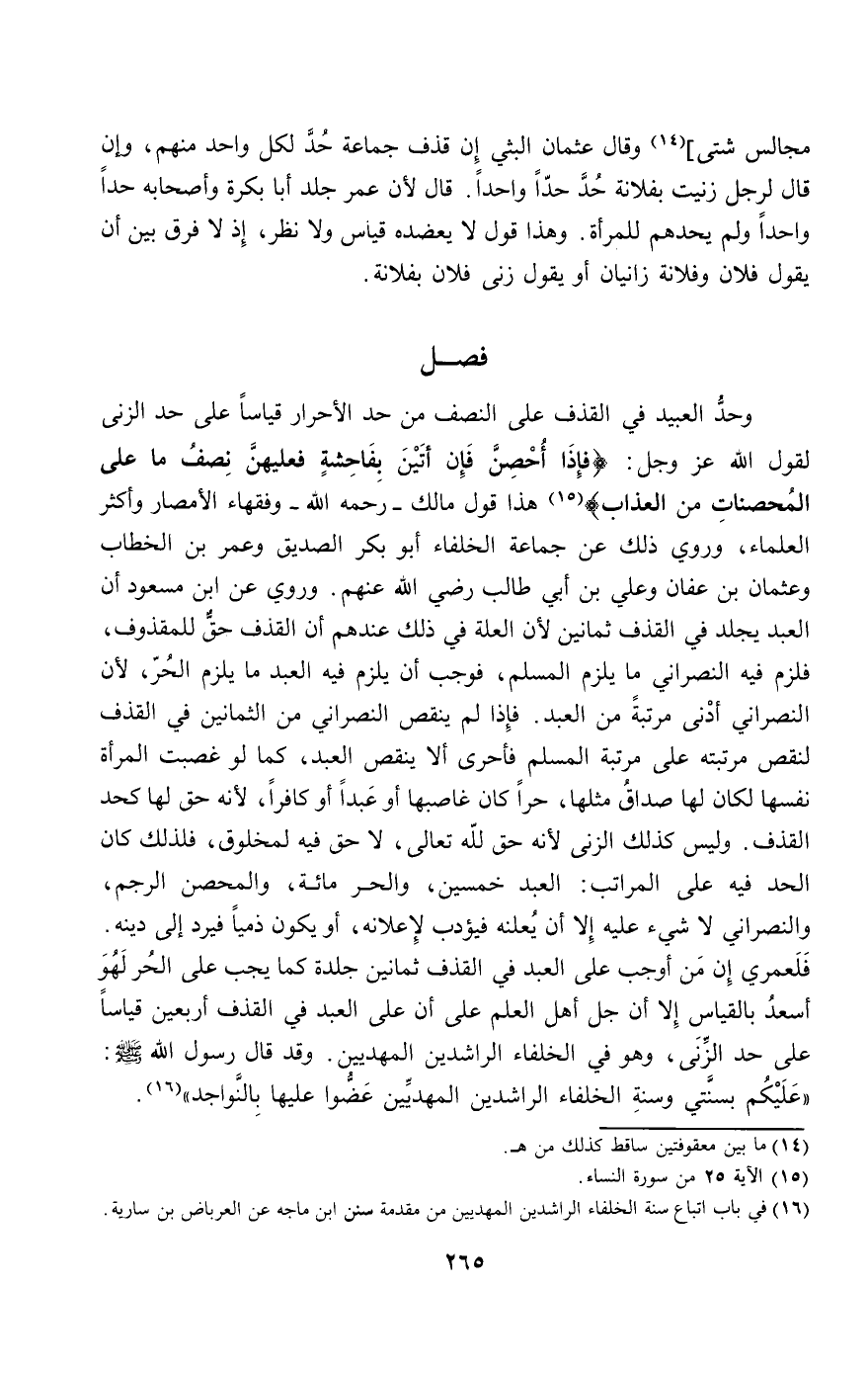 وحد العبيد في القذف على النصف من حد الأحرار قياسا على حد الزنى لقول الله عز وجل: {فَإِذَا أُحْصِنَّ فَإِنْ أَتَيْنَ بِفَاحِشَةٍ فَعَلَيْهِنَّ نِصْفُ مَا عَلَى الْمُحْصَنَاتِ مِنَ الْعَذَابِ} [النساء: 25] هذا قول مالك - رَحِمَهُ اللَّهُ - وفقهاء الأمصار وأكثر العلماء، وروي ذلك عن جماعة الخلفاء أبو بكر الصديق وعمر بن الخطاب وعثمان بن عفان وعلي بن أبي طالب - رَضِيَ اللَّهُ عَنْهُمْ -. وروي عن ابن مسعود أن العبد يجلد في القذف ثمانين لأن العلة في ذلك عندهم أن القذف حق للمقذوف، فلزم فيه النصراني ما يلزم المسلم، فوجب أن يلزم فيه العبد ما يلزم الحر، لأن النصراني أدنى مرتبة من العبد. فإذا لم ينقص النصراني من الثمانين في القذف لنقص مرتبته على مرتبة المسلم فأحرى ألا ينقص العبد، كما لو غصبت المرأة نفسها لكان لها صداق مثلها، حرا كان غاصبها أو عبدا أو كافرا، لأنه حق لها كحد القذف. وليس كذلك الزنى لأنه حق لله تعالى، لا حق فيه لمخلوق، فلذلك كان الحد فيه على المراتب: العبد خمسين، والحر مائة، والمحصن الرجم، والنصراني لا شيء عليه إلا أن يعلنه فيؤدب لإعلانه، أو يكون ذميا فيرد إلى دينه. فلعمري إن من أوجب على العبد في القذف ثمانين جلدة كما يجب على الحر لهو أسعد بالقياس إلا أن جل أهل العلم على أن على العبد في القذف أربعين قياسا على حد الزنى، وهو في الخلفاء الراشدين المهديين. وقد قال رسول الله - صَلَّى اللَّهُ عَلَيْهِ وَسَلَّمَ -: «عليكم بسنتي وسنة الخلفاء الراشدين المهديين عضوا عليها بالنواجد».