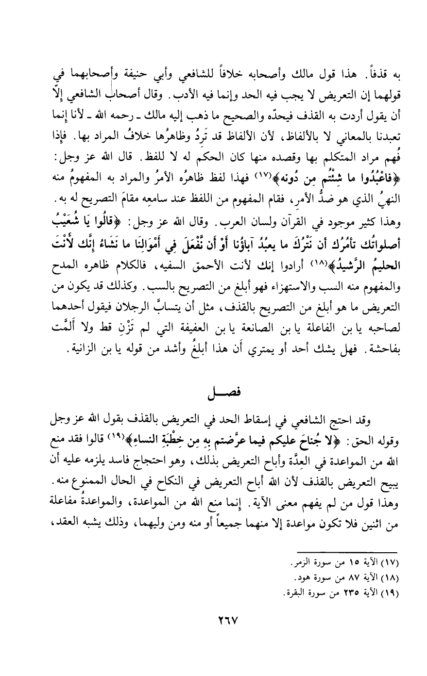 وقد احتج الشافعي في إسقاط الحد في التعريض بالقذف بقول الله عز وجل وقوله الحق: {وَلا جُنَاحَ عَلَيْكُمْ فِيمَا عَرَّضْتُمْ بِهِ مِنْ خِطْبَةِ النِّسَاءِ} [البقرة: 235] قالوا فقد منع الله من المواعدة في العدة وأباح التعريض بذلك، وهو احتجاج فاسد يلزمه عليه أن يبيح التعريض بالقذف لأن الله أباح التعريض في النكاح في الحال الممنوع منه. وهذا قول من لم يفهم معنى الآية. إنما منع الله من المواعدة، والمواعدة مفاعلة من اثنين فلا تكون مواعدة إلا منهما جميعا أو منه ومن وليهما، وذلك يشبه العقد،