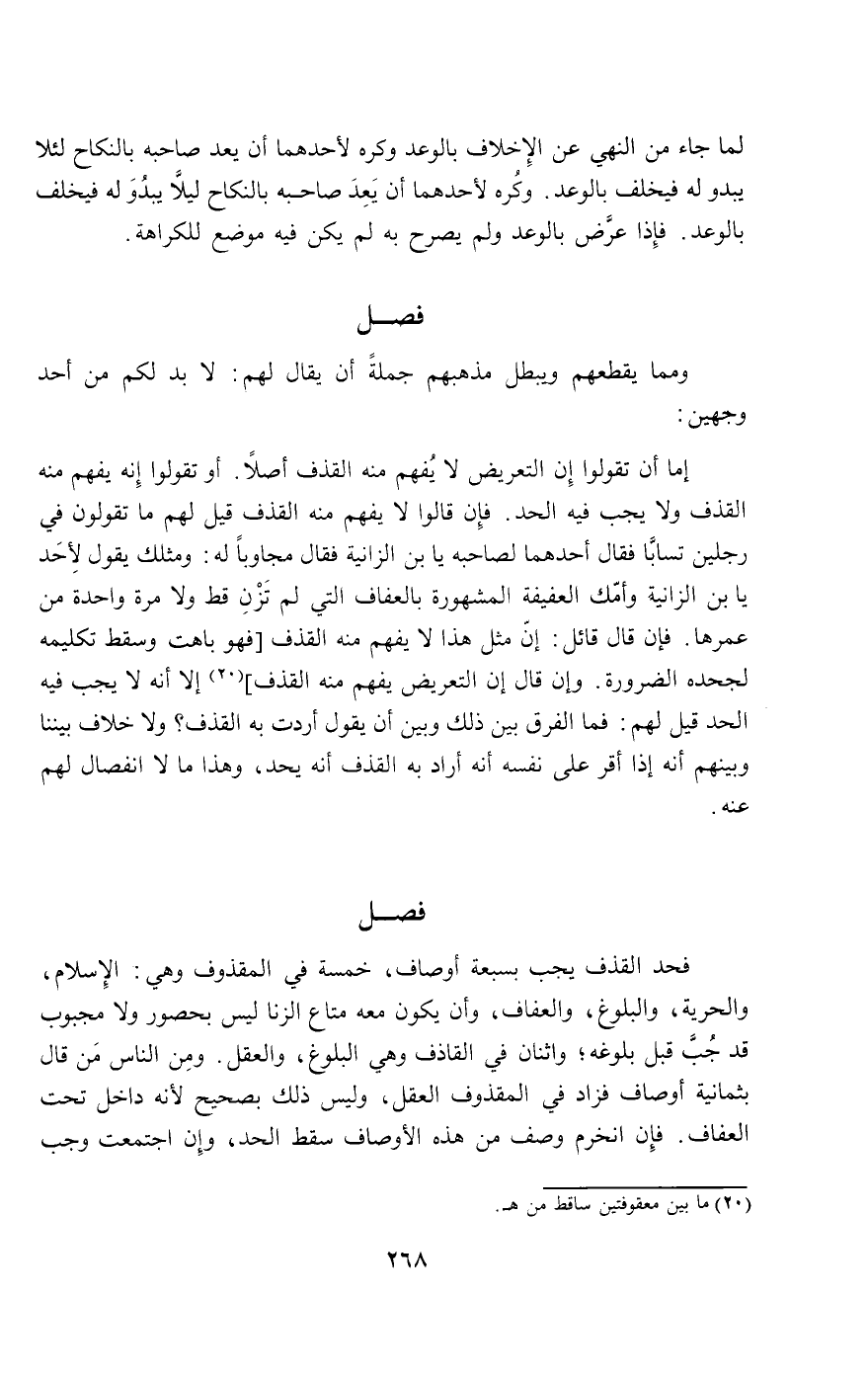 فحد القذف يجب بسبعة أوصاف، خمسة في المقذوف وهي: الإسلام، والحرية، والبلوغ، والعفاف، وأن يكون معه متاع الزنا ليس بحصور ولا مجبوب قد جب قبل بلوغه، واثنان في القاذف وهي البلوغ، والعقل. ومن الناس من قال بثمانية أوصاف فزاد في المقذوف العقل، وليس ذلك بصحيح لأنه داخل تحت العفاف. فإن انخرم وصف من هذه الأوصاف سقط الحد، وإن اجتمعت وجب