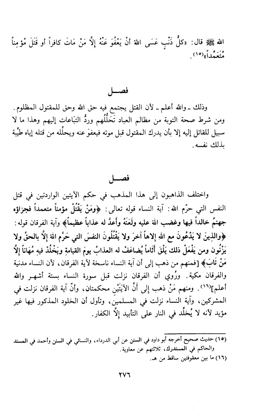 واختلف الذاهبون إلى هذا المذهب في حكم الآيتين الواردتين في قتل النفس التي حرم الله: آية النساء قَوْله تَعَالَى: {وَمَنْ يَقْتُلْ مُؤْمِنًا مُتَعَمِّدًا فَجَزَاؤُهُ جَهَنَّمُ خَالِدًا فِيهَا وَغَضِبَ اللَّهُ عَلَيْهِ وَلَعَنَهُ وَأَعَدَّ لَهُ عَذَابًا عَظِيمًا} [النساء: 93] وآية الفرقان قوله: {وَالَّذِينَ لا يَدْعُونَ مَعَ اللَّهِ إِلَهًا آخَرَ وَلا يَقْتُلُونَ النَّفْسَ الَّتِي حَرَّمَ اللَّهُ إِلا بِالْحَقِّ وَلا يَزْنُونَ وَمَنْ يَفْعَلْ ذَلِكَ يَلْقَ أَثَامًا} [الفرقان: 68] {يُضَاعَفْ لَهُ الْعَذَابُ يَوْمَ الْقِيَامَةِ وَيَخْلُدْ فِيهِ مُهَانًا} [الفرقان: 69] {إِلا مَنْ تَابَ} [الفرقان: 70]. ومنهم من ذهب إلى أن الآيتين محكمتان، وأن آية الفرقان نزلت في المشركين، وآية النساء نزلت في المسلمين، وتأول أن الخلود المذكور فيها غير مؤيد لأنه لا يخلد في النار على التأبيد إلا الكفار.