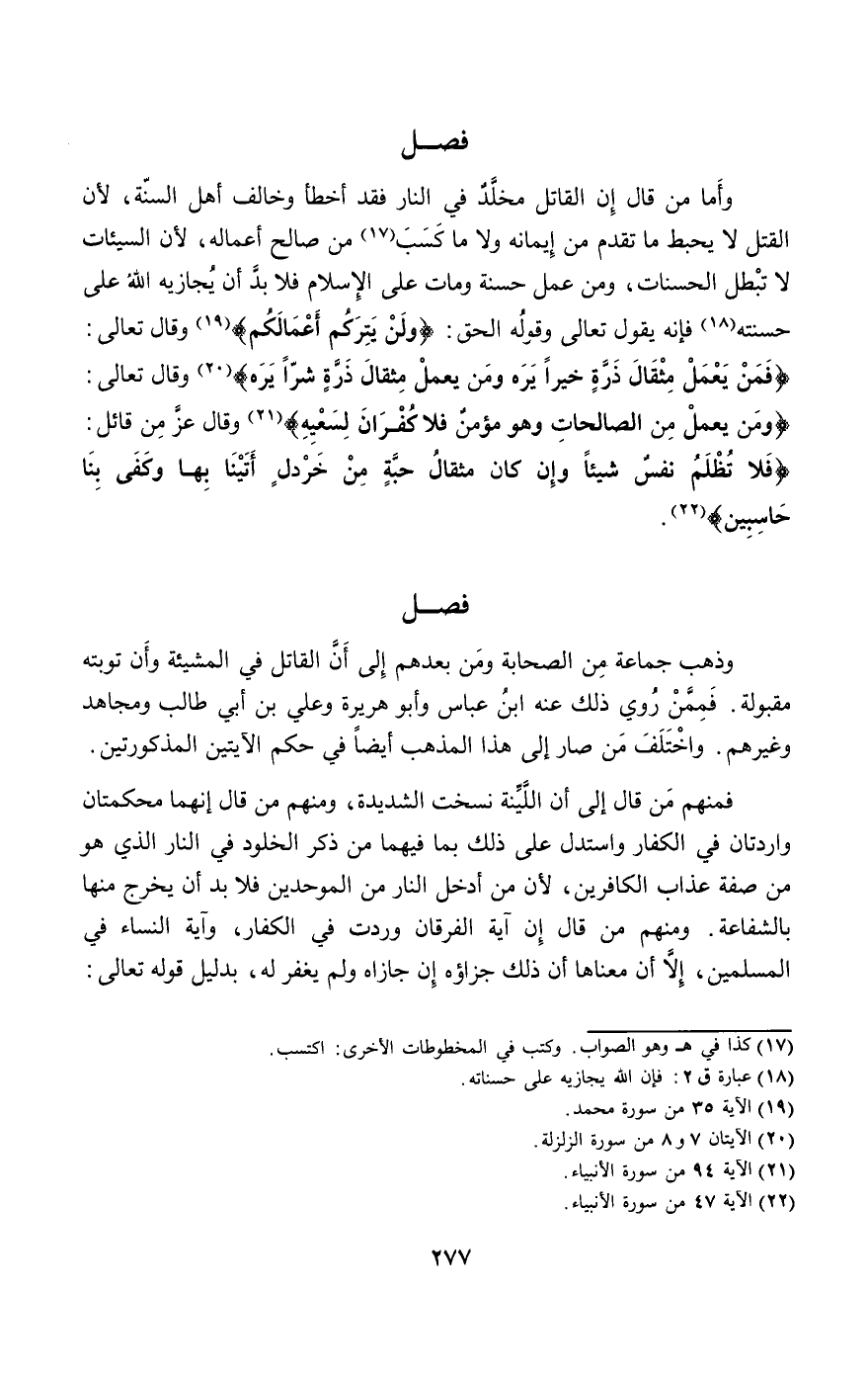 وأما من قال: إن القاتل مخلد في النار فقد أخطأ وخالف أهل السنة، لأن القتل لا يحبط ما تقدم من إيمانه ولا ما كسب من صالح أعماله، لأن السيئات لا تبطل الحسنات، ومن عمل حسنة ومات على الإسلام فلا بد أن يجازيه الله على حسنته فإنه يقول تعالى وقوله الحق: {وَلَنْ يَتِرَكُمْ أَعْمَالَكُمْ} [محمد: 35] وقال تعالى: {فَمَنْ يَعْمَلْ مِثْقَالَ ذَرَّةٍ خَيْرًا يَرَهُ} [الزلزلة: 7] {وَمَنْ يَعْمَلْ مِثْقَالَ ذَرَّةٍ شَرًّا يَرَهُ} [الزلزلة: 8] وقال تعالى: {فَمَنْ يَعْمَلْ مِنَ الصَّالِحَاتِ وَهُوَ مُؤْمِنٌ فَلا كُفْرَانَ لِسَعْيِهِ} [الأنبياء: 94] وقال عز من قائل: {فَلا تُظْلَمُ نَفْسٌ شَيْئًا وَإِنْ كَانَ مِثْقَالَ حَبَّةٍ مِنْ خَرْدَلٍ أَتَيْنَا بِهَا وَكَفَى بِنَا حَاسِبِينَ} [الأنبياء: 47].