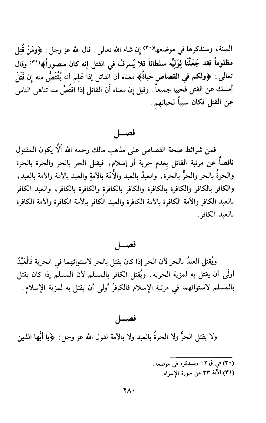 فمن شرائط صحة القصاص على مذهب مالك - رَحِمَهُ اللَّهُ - ألا يكون المقتول ناقصا عن مرتبة القاتل بعدم حرية أو إسلام، فيقتل الحر بالحر والحرة بالحرة والحرة بالحر والحر بالحرة، والعبد بالعبد والأمة بالأمة والعبد بالأمة والأمة بالعبد، والكافر بالكافر والكافرة بالكافرة والكافر بالكافرة والكافرة بالكافر، والعبد الكافر بالعبد الكافر والأمة الكافرة بالأمة الكافرة والعبد الكافر بالأمة الكافرة والأمة الكافرة بالعبد الكافر.