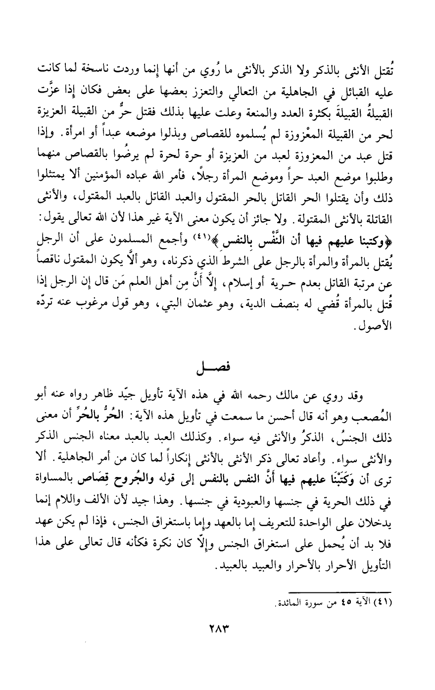 وقد روي عن مالك - رَحِمَهُ اللَّهُ - في هذه الآية تأويل جيد ظاهر رواه عنه أبو المصعب وهو أنه قال أحسن ما سمعت في تأويل هذه الآية: الحر بالحر أن معنى ذلك الجنس، الذكر والأنثى فيه سواء. وكذلك العبد بالعبد معناه الجنس الذكر والأنثى سواء. وأعاد تعالى ذكر الأنثى بالأنثى إنكارا لما كان من أمر الجاهلية. ألا ترى أن {وَكَتَبْنَا عَلَيْهِمْ فِيهَا أَنَّ النَّفْسَ بِالنَّفْسِ} [المائدة: 45] إلى قوله {وَالْجُرُوحَ قِصَاصٌ} [المائدة: 45] بالمساواة في ذلك الحرية في جنسها والعبودية في جنسها. وهذا جيد لأن الألف واللام إنما يدخلان على الواحدة للتعريف إما بالعهد وإما باستغراق الجنس، فإذا لم يكن عهد فلا بد أن يحمل على استغراق الجنس وإلا كان نكرة فكأنه قال تعالى على هذا التأويل الأحرار بالأحرار والعبيد بالعبيد.
