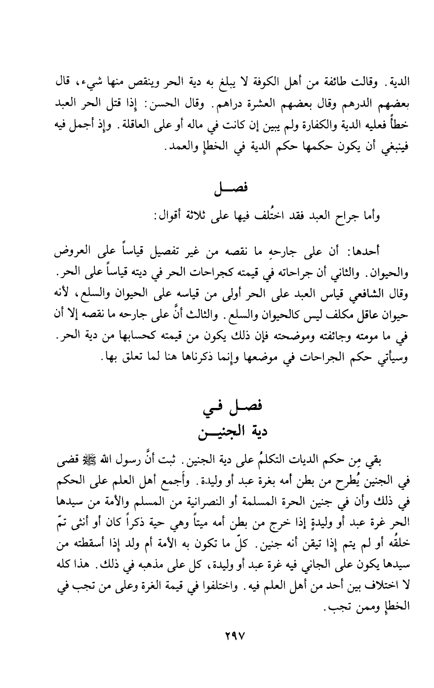 بقي من حكم الديات التكلم على دية الجنين. ثبت أن رسول الله - صَلَّى اللَّهُ عَلَيْهِ وَسَلَّمَ - «قضى في الجنين يطرح من بطن أمه بغرة عبد أو وليدة». وأجمع أهل العلم على الحكم في ذلك وأن في جنين الحرة المسلمة أو النصرانية من المسلم والأمة من سيدها الحر غرة عبد أو وليدة إذا خرج من بطن أمه ميتا وهي حية ذكرا كان أو أنثى تم خلقه أو لم يتم إذا تيقن أنه جنين. كل ما تكون به الأمة أم ولد إذا أسقطته من سيدها يكون على الجاني فيه غرة عبد أو وليدة، كل على مذهبه في ذلك. هذا كله لا اختلاف بين أحد من أهل العلم فيه. واختلفوا في قيمة الغرة وعلى من تجب في الخطأ وممن تجب.