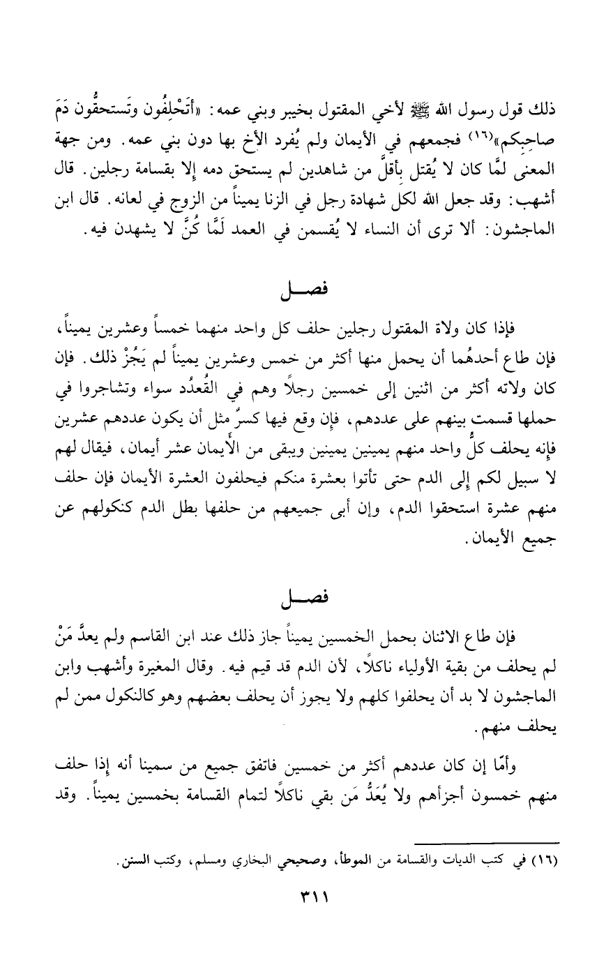 ذلك «قول رسول الله - صَلَّى اللَّهُ عَلَيْهِ وَسَلَّمَ - لأخي المقتول بخيبر وبني عمه: "أتحلفون وتستحقون دم صاحبكم» فجمعهم في الأيمان ولم يفرد الأخ بها دون بني عمه. ومن جهة المعنى لما كان لا يقتل بأقل من شاهدين لم يستحق دمه إلا بقسامة رجلين. قال أشهب: وقد جعل الله لكل شهادة رجل في الزنا يمينا من الزوج في لعانه. قال ابن الماجشون: ألا ترى أن النساء لا يقسمن في العمد لما كن لا يشهدن فيه.