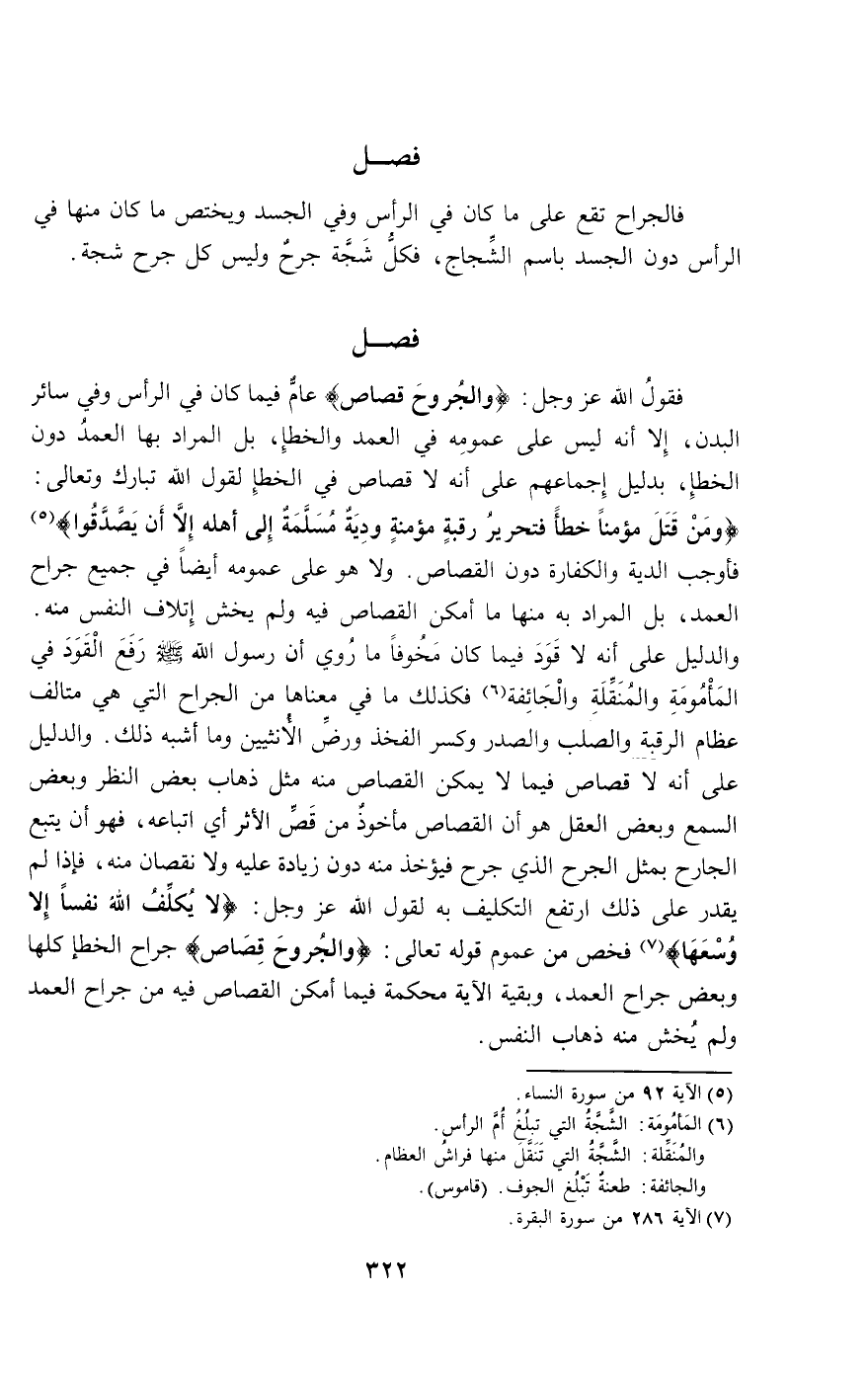 فقول الله عز وجل: {وَالْجُرُوحَ قِصَاصٌ} [المائدة: 45] عام فيما كان في الرأس وفي سائر البدن، إلا أنه ليس على عمومه في العمد والخطأ، بل المراد بها العمد دون الخطأ، بدليل إجماعهم على أنه لا قصاص في الخطأ لقول الله تبارك وتعالى: {وَمَنْ قَتَلَ مُؤْمِنًا خَطَأً فَتَحْرِيرُ رَقَبَةٍ مُؤْمِنَةٍ وَدِيَةٌ مُسَلَّمَةٌ إِلَى أَهْلِهِ إِلا أَنْ يَصَّدَّقُوا} [النساء: 92] فأوجب الدية والكفارة دون القصاص. ولا هو على عمومه أيضا في جميع جراح العمد، بل المراد به منها ما أمكن القصاص فيه ولم يخش إتلاف النفس منه. والدليل على أنه لا قود فيما كان مخوفا ما روي «أن رسول الله - صَلَّى اللَّهُ عَلَيْهِ وَسَلَّمَ - رفع القود في المأمومة والمنقلة والجائفة» فكذلك ما في معناها من الجراح التي هي متالف عظام الرقبة والصلب والصدر وكسر الفخذ ورض الأنثيين وما أشبه ذلك. والدليل على أنه لا قصاص فيما لا يمكن القصاص منه مثل ذهاب بعض النظر وبعض السمع وبعض العقل هو أن القصاص مأخوذ من قص الأثر أي اتباعه، فهو أن يتبع الجارح بمثل الجرح الذي جرح فيؤخذ منه دون زيادة عليه ولا نقصان منه، فإذا لم يقدر على ذلك ارتفع التكليف به لقول الله عز وجل: {لا يُكَلِّفُ اللَّهُ نَفْسًا إِلا وُسْعَهَا} [البقرة: 286] فخص من عموم قَوْله تَعَالَى: {وَالْجُرُوحَ قِصَاصٌ} [المائدة: 45] جراح الخطأ كلها وبعض جراح العمد، وبقية الآية محكمة فيما أمكن القصاص فيه من جراح العمد ولم يخش منه ذهاب النفس.