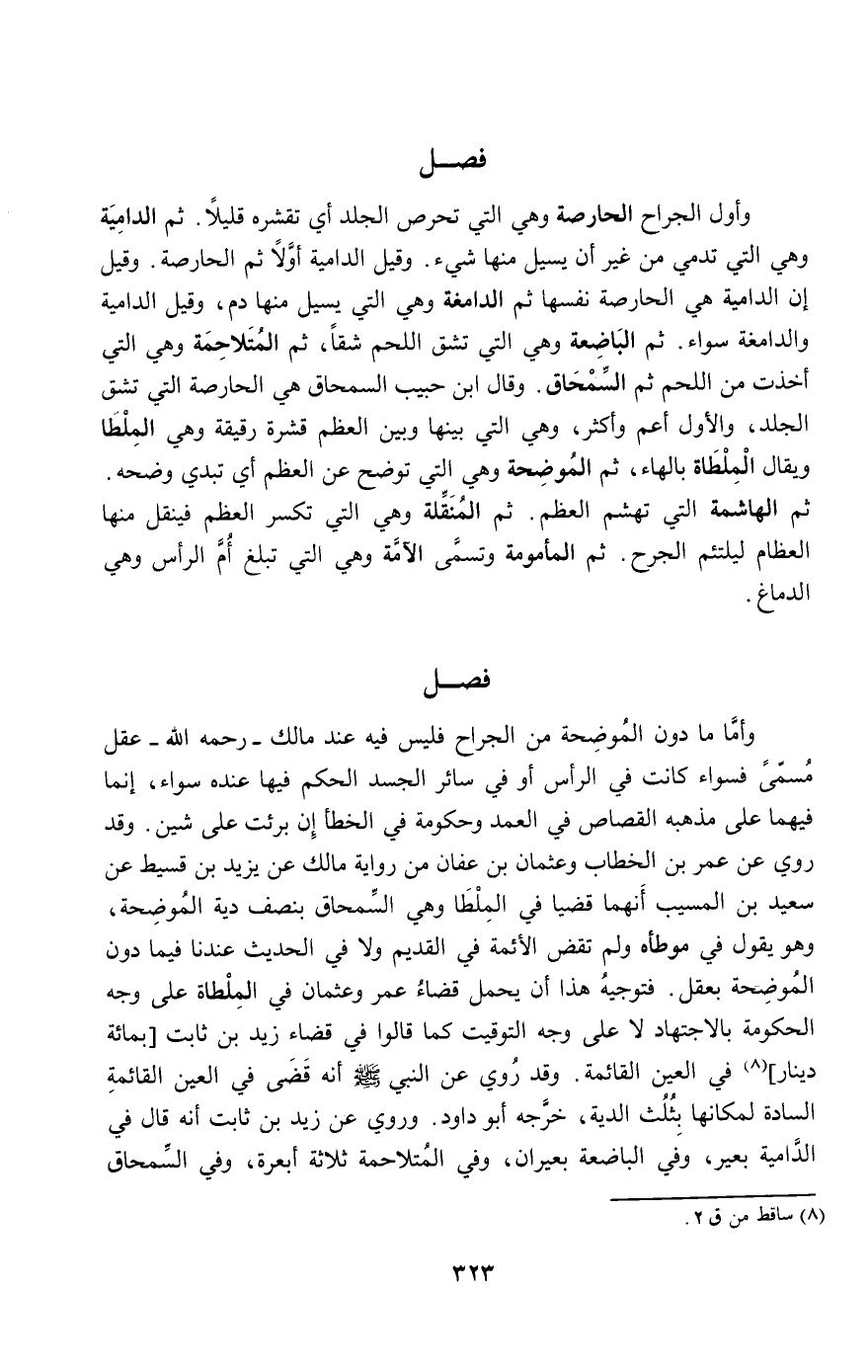 وأول الجراح الحارصة وهي التي تحرص الجلد أي تقشره قليلا. ثم الدامية وهي التي تدمي من غير أن يسيل منها شيء. وقيل الدامية أولا ثم الحارصة. وقيل إن الدامية هي الحارصة نفسها ثم الدامغة وهي التي يسيل منها دم، وقيل الدامية والدامغة سواء. ثم الباضعة وهي التي تشق اللحم شقا، ثم المتلاحمة وهي التي أخذت من اللحم ثم السمحاق. وقال ابن حبيب السمحاق: هي الحارصة التي تشق الجلد، والأول أعم وأكثر، وهي التي بينها وبين العظم قشرة رقيقة وهي الملطا ويقال الملطاة بالهاء، ثم الموضحة وهي التي توضح عن العظم أي تبدي وضحه. ثم الهاشمة التي تهشم العظم. ثم المنقلة وهي التي تكسر العظم فينقل منها العظام ليلتئم الجرح. ثم المأمومة وتسمى الآمة وهي التي تبلغ أم الرأس وهي الدماغ.