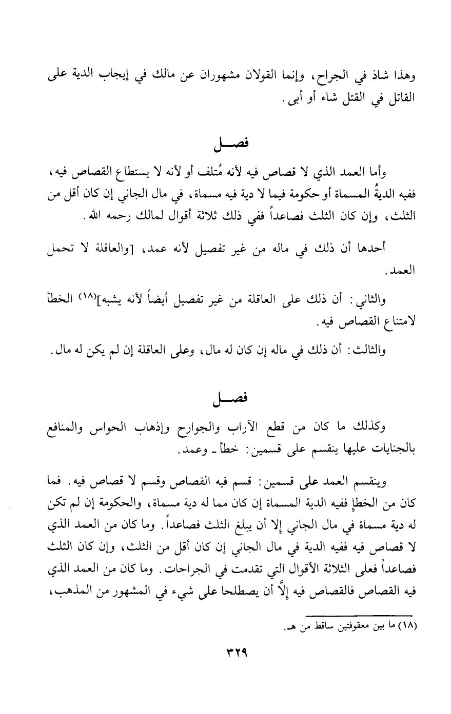 وينقسم العمد على قسمين: قسم فيه القصاص وقسم لا قصاص فيه. فما كان من الخطأ ففيه الدية المسماة إن كان مما له دية مسماة، والحكومة إن لم تكن له دية مسماة في مال الجاني إلا أن يبلغ الثلث فصاعدا. وما كان من العمد الذي لا قصاص فيه ففيه الدية في مال الجاني إن كان أقل من الثلث، وإن كان الثلث فصاعدا فعلى الثلاثة الأقوال التي تقدمت في الجراحات. وما كان من العمد الذي فيه القصاص فالقصاص فيه إلا أن يصطلحا على شيء في المشهور من المذهب،