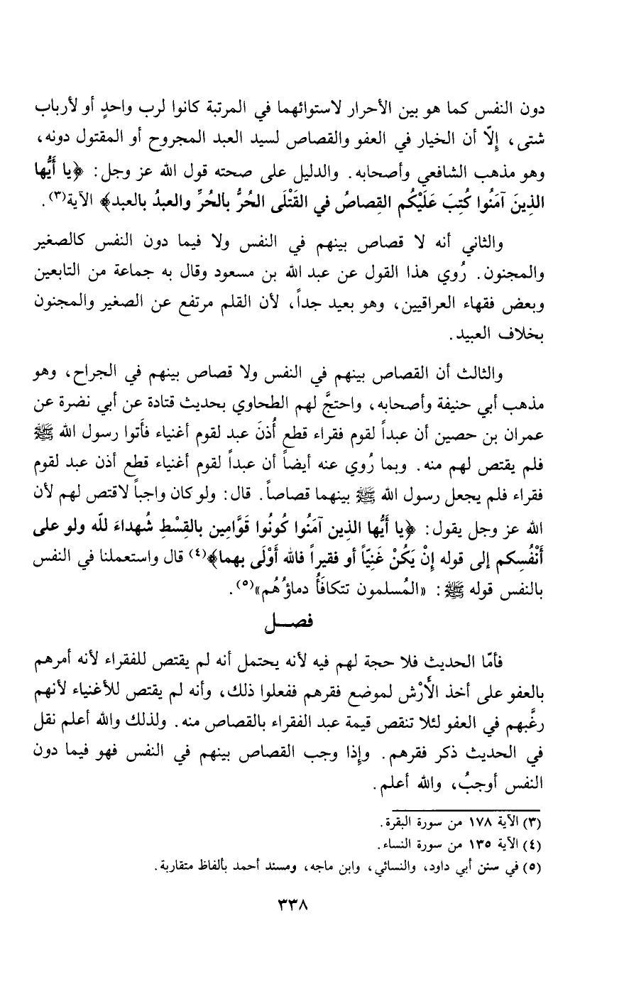 والثالث: أن القصاص بينهم في النفس ولا قصاص بينهم في الجراح، وهو مذهب أبي حنيفة وأصحابه، واحتج لهم الطحاوي بحديث قتادة عن أبي نضرة عن عمران بن حصين «أن عبدا لقوم فقراء قطع أذن عبد لقوم أغنياء فأتوا رسول الله - صَلَّى اللَّهُ عَلَيْهِ وَسَلَّمَ - فلم يقتص لهم منه». وبما روي عنه أيضا «أن عبدا لقوم أغنياء قطع أذن عبد لقوم فقراء فلم يجعل رسول الله - صَلَّى اللَّهُ عَلَيْهِ وَسَلَّمَ - بينهما قصاصا». قال: ولو كان واجبا لاقتص لهم لأن الله عز وجل يقول: {يَا أَيُّهَا الَّذِينَ آمَنُوا كُونُوا قَوَّامِينَ بِالْقِسْطِ شُهَدَاءَ لِلَّهِ وَلَوْ عَلَى أَنْفُسِكُمْ} [النساء: 135] إلى قوله {إِنْ يَكُنْ غَنِيًّا أَوْ فَقِيرًا فَاللَّهُ أَوْلَى بِهِمَا} [النساء: 135] قال واستعملنا في النفس بالنفس قوله - صَلَّى اللَّهُ عَلَيْهِ وَسَلَّمَ -: «المسلمون تتكافأ دماؤهم».