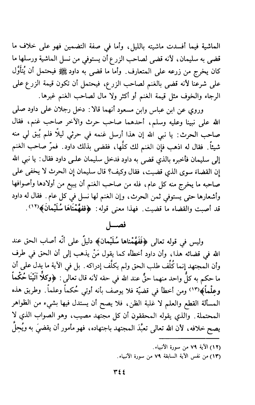 وليس في قَوْله تَعَالَى {فَفَهَّمْنَاهَا سُلَيْمَانَ} [الأنبياء: 79] دليل على أنه أصاب الحق عند الله في قضائه هذا، وأن داود أخطأه كما يقول من يذهب إلى أن الحق في طرف وأن المجتهد إنما كلف طلب الحق ولم يكلف إدراكه. بل في الآية ما يدل على أن ما حكم به كل واحد منهما حق عند الله في حقه لأنه قال تعالى: {وَكُلا آتَيْنَا حُكْمًا وَعِلْمًا} [الأنبياء: 79] ومن أخطأ في قضية فلا يوصف بأنه أوتي حكما وعلما. وطريق هذه المسألة القطع والعلم لا غلبة الظن، فلا يصح أن يستدل فيها بشيء من الظواهر المحتملة. والذي يقوله المحققون أن كل مجتهد مصيب، وهو الصواب الذي لا يصح خلافه، لأن الله تعالى تعبد المجتهد باجتهاده، فهو مأمور أن يقضي به ويحل