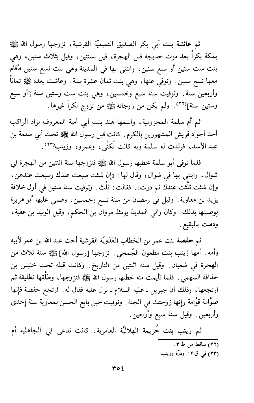 ثم عائشة بنت أبي بكر الصديق التميمية القرشية، تزوجها رسول الله - صَلَّى اللَّهُ عَلَيْهِ وَسَلَّمَ - بمكة بكرا بعد موت خديجة قبل الهجرة، قيل بسنتين، وقيل بثلاث سنين، وهي بنت ست سنين أو سبع سنين، وابتنى بها في المدينة وهي بنت تسع سنين فأقام معها تسع سنين. وتوفي عنها وهي بنت ثمان عشرة سنة. وعاشت بعده - صَلَّى اللَّهُ عَلَيْهِ وَسَلَّمَ - ثمان وأربعين سنة. وتوفيت سنة سبع وخمسين، وهي بنت ست وستين سنة. ولم يكن من زوجاته - صَلَّى اللَّهُ عَلَيْهِ وَسَلَّمَ - من تزوج بكرا غيرها.