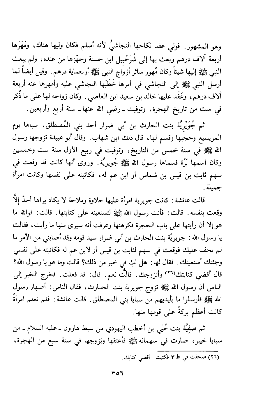 قالت عائشة: «كانت جويرية امرأة عليها حلاوة وملاحة لا يكاد يراها أحد إلا وقعت بنفسه. قالت: فأتت رسول الله - صَلَّى اللَّهُ عَلَيْهِ وَسَلَّمَ - لتستعينه على كتابتها. قالت: فو الله ما هو إلا أن رأيتها على باب الحجرة فكرهتها وعرفت أنه سيرى منها ما رأيت، فقالت يا رسول الله: جويرية بنت الحارث بن أبي ضرار سيد قومه وقد أصابني من الأمر ما لم يخف عليك فوقعت في سهم لثابت بن قيس أو لابن عم له فكاتبته على نفسي وجئتك أستعينك. فقال لها: هل لك في خير من ذلك؟ قالت وما هو يا رسول الله؟ قال أقضي كتابتك وأتزوجك. قالت نعم. قال: قد فعلت. فخرج الخبر إلى الناس أن رسول الله - صَلَّى اللَّهُ عَلَيْهِ وَسَلَّمَ - تزوج جويرية بنت الحارث، فقال الناس: أصهار رسول الله - صَلَّى اللَّهُ عَلَيْهِ وَسَلَّمَ - فأرسلوا ما بأيديهم من سبايا بني المصطلق. قالت عائشة: فلم نعلم امرأة كانت أعظم بركة على قومها منها».