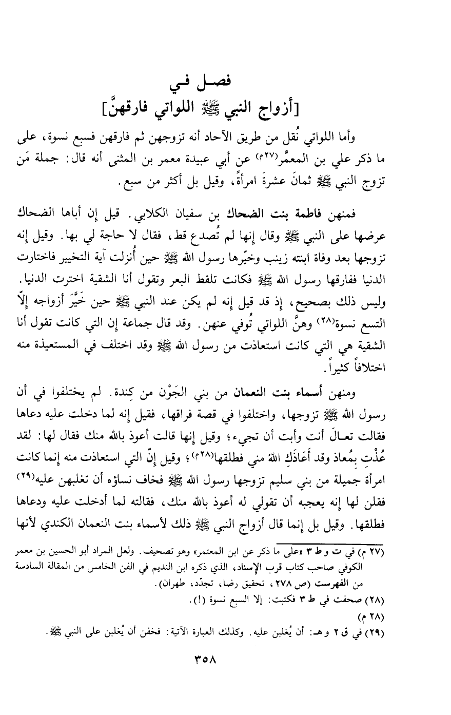 وأما اللواتي نقل من طريق الآحاد أنه تزوجهن ثم فارقهن فسبع نسوة، على ما ذكر علي بن المعمر عن أبي عبيدة معمر بن المثنى أنه قال: جملة من تزوج النبي - صَلَّى اللَّهُ عَلَيْهِ وَسَلَّمَ - ثمان عشرة امرأة، وقيل بل أكثر من سبع.