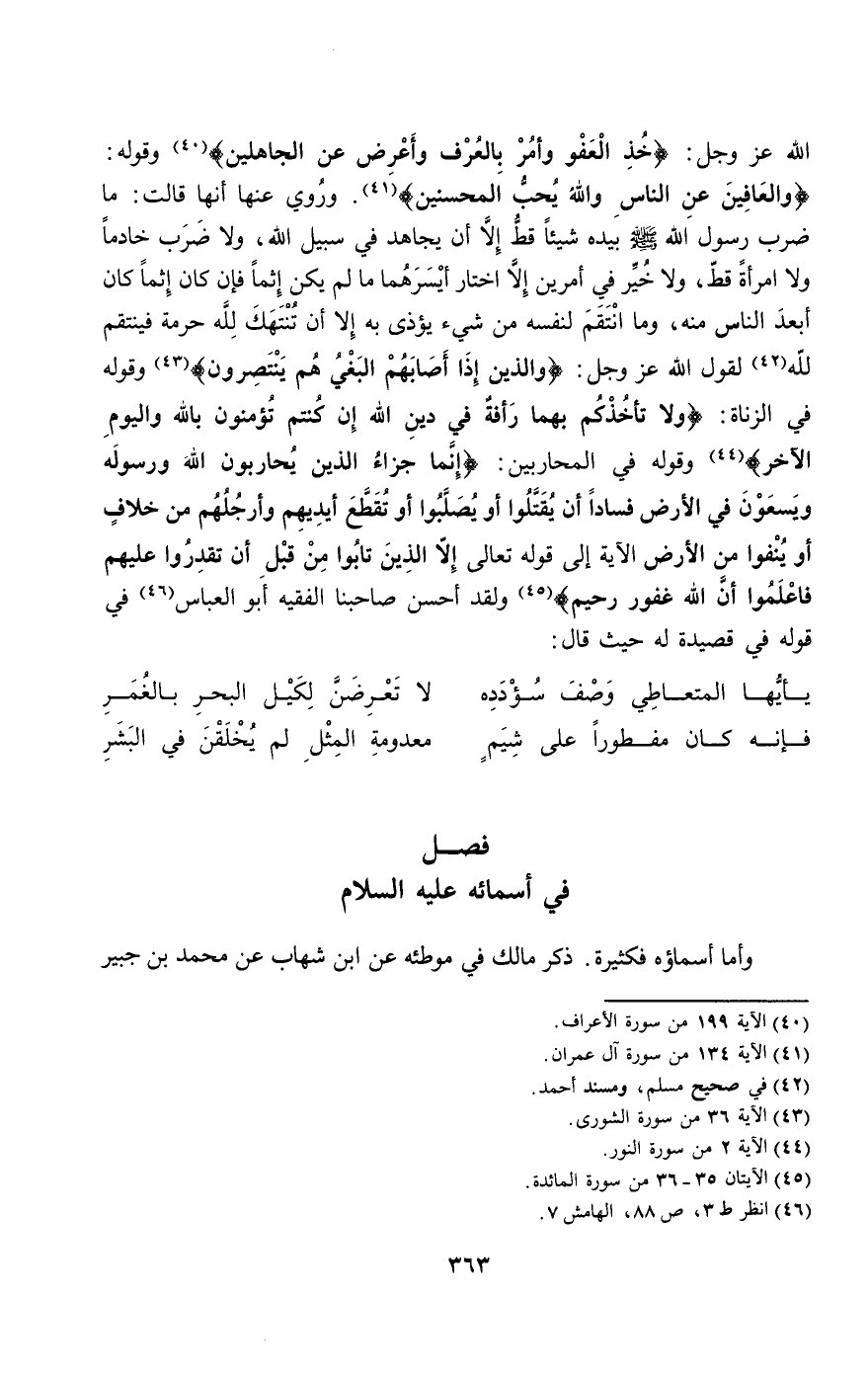 الله عز وجل: {خُذِ الْعَفْوَ وَأْمُرْ بِالْعُرْفِ وَأَعْرِضْ عَنِ الْجَاهِلِينَ} [الأعراف: 199]» وقوله: {وَالْعَافِينَ عَنِ النَّاسِ وَاللَّهُ يُحِبُّ الْمُحْسِنِينَ} [آل عمران: 134]. وروي عنها أنها قالت: «ما ضرب رسول الله - صَلَّى اللَّهُ عَلَيْهِ وَسَلَّمَ - بيده شيئا قط إلا أن يجاهد في سبيل الله، ولا ضرب خادما ولا امرأة قط، ولا خير في أمرين إلا اختار أيسرهما ما لم يكن إثما فإن كان إثما كان أبعد الناس منه، وما انتقم لنفسه من شيء يؤذى به إلا أن تنتهك لله حرمة فينتقم لله» لقول الله عز وجل: {وَالَّذِينَ إِذَا أَصَابَهُمُ الْبَغْيُ هُمْ يَنْتَصِرُونَ} [الشورى: 39] وقوله في الزناة: {وَلا تَأْخُذْكُمْ بِهِمَا رَأْفَةٌ فِي دِينِ اللَّهِ إِنْ كُنْتُمْ تُؤْمِنُونَ بِاللَّهِ وَالْيَوْمِ الآخِرِ} [النور: 2] وقوله في المحاربين: {إِنَّمَا جَزَاءُ الَّذِينَ يُحَارِبُونَ اللَّهَ وَرَسُولَهُ وَيَسْعَوْنَ فِي الأَرْضِ فَسَادًا أَنْ يُقَتَّلُوا أَوْ يُصَلَّبُوا أَوْ تُقَطَّعَ أَيْدِيهِمْ وَأَرْجُلُهُمْ مِنْ خِلافٍ أَوْ يُنْفَوْا مِنَ الأَرْضِ} [المائدة: 33] الآية إلى قَوْله تَعَالَى {إِلا الَّذِينَ تَابُوا مِنْ قَبْلِ أَنْ تَقْدِرُوا عَلَيْهِمْ فَاعْلَمُوا أَنَّ اللَّهَ غَفُورٌ رَحِيمٌ} [المائدة: 34] ولقد أحسن صاحبنا الفقيه أبو العباس في قوله في قصيدة له حيث قال: