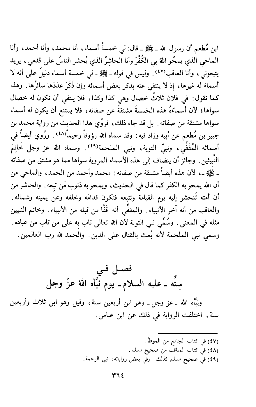 ابن مطعم «أن رسول الله- صَلَّى اللَّهُ عَلَيْهِ وَسَلَّمَ - قال: لي خمسة أسماء، أنا محمد، وأنا أحمد، وأنا الماحي الذي يمحو الله بي الكفر وأنا الحاشر الذي يحشر الناس على قدمي، يريد يتبعوني، وأنا العاقب». وليس في قوله- صَلَّى اللَّهُ عَلَيْهِ وَسَلَّمَ - لي خمسة أسماء دليل على أنه لا أسماء له غيرها، إذ لا ينتفي عنه بذكر بعض أسمائه وإن ذكر عددها سائرها. وهذا كما تقول: في فلان ثلاث خصال وهي كذا وكذا، فلا ينتفي أن تكون له خصال سواها؛ لأن أسماءه هذه الخمسة مشتقة عن صفاته، فلا يمتنع أن يكون له أسماء سواها مشتقة من صفاته. بل قد جاء ذلك، فروي هذا الحديث من رواية محمد بن جبير بن مطعم عن أبيه وزاد فيه: وقد سماه الله رؤوفا رحيما. وروي أيضا في أسمائه المقفي، ونبي التوبة، ونبي الملحمة. وسماه الله عز وجل خاتم النبيئين. وجائز أن ينضاف إلى هذه الأسماء المروية سواها مما هو مشتق من صفاته - صَلَّى اللَّهُ عَلَيْهِ وَسَلَّمَ -، لأن هذه أيضا مشتقة من صفاته: محمد وأحمد من الحمد، والماحي من أن الله يمحو به الكفر كما قال في الحديث، ويمحو به ذنوب من تبعه. والحاشر من أن أمته تنحشر إليه يوم القيامة وتتبعه فتكون قدامه وخلفه وعن يمينه وشماله. والعاقب من أنه آخر الأنبياء. والمقفي أنه قفا من قبله من الأنبياء. وخاتم النبيين مثله في المعنى. وسمي نبي التوبة لأن الله تعالى تاب به على من تاب من عباده. وسمي نبي الملحمة لأنه بعث بالقتال على الدين. والحمد لله رب العالمين.