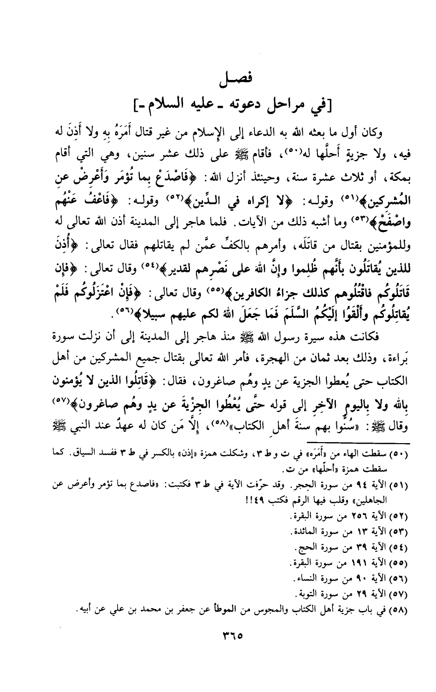 وكان أول ما بعثه الله به الدعاء إلى الإسلام من غير قتال أمره به ولا أذن له فيه، ولا جزية أحلها له، فأقام - صَلَّى اللَّهُ عَلَيْهِ وَسَلَّمَ - على ذلك عشر سنين، وهي التي أقام بمكة، أو ثلاث عشرة سنة، وحينئذ أنزل الله: {فَاصْدَعْ بِمَا تُؤْمَرُ وَأَعْرِضْ عَنِ الْمُشْرِكِينَ} [الحجر: 94] وقوله: {لا إِكْرَاهَ فِي الدِّينِ} [البقرة: 256] وقوله: {فَاعْفُ عَنْهُمْ وَاصْفَحْ} [المائدة: 13] وما أشبه ذلك من الآيات. فلما هاجر إلى المدينة أذن الله تعالى له وللمؤمنين بقتال من قاتله، وأمرهم بالكف عمن لم يقاتلهم فقال تعالى: {أُذِنَ لِلَّذِينَ يُقَاتَلُونَ بِأَنَّهُمْ ظُلِمُوا وَإِنَّ اللَّهَ عَلَى نَصْرِهِمْ لَقَدِيرٌ} [الحج: 39] وقال تعالى: {فَإِنْ قَاتَلُوكُمْ فَاقْتُلُوهُمْ كَذَلِكَ جَزَاءُ الْكَافِرِينَ} [البقرة: 191] وقال تعالى: {فَإِنِ اعْتَزَلُوكُمْ فَلَمْ يُقَاتِلُوكُمْ وَأَلْقَوْا إِلَيْكُمُ السَّلَمَ فَمَا جَعَلَ اللَّهُ لَكُمْ عَلَيْهِمْ سَبِيلا} [النساء: 90].