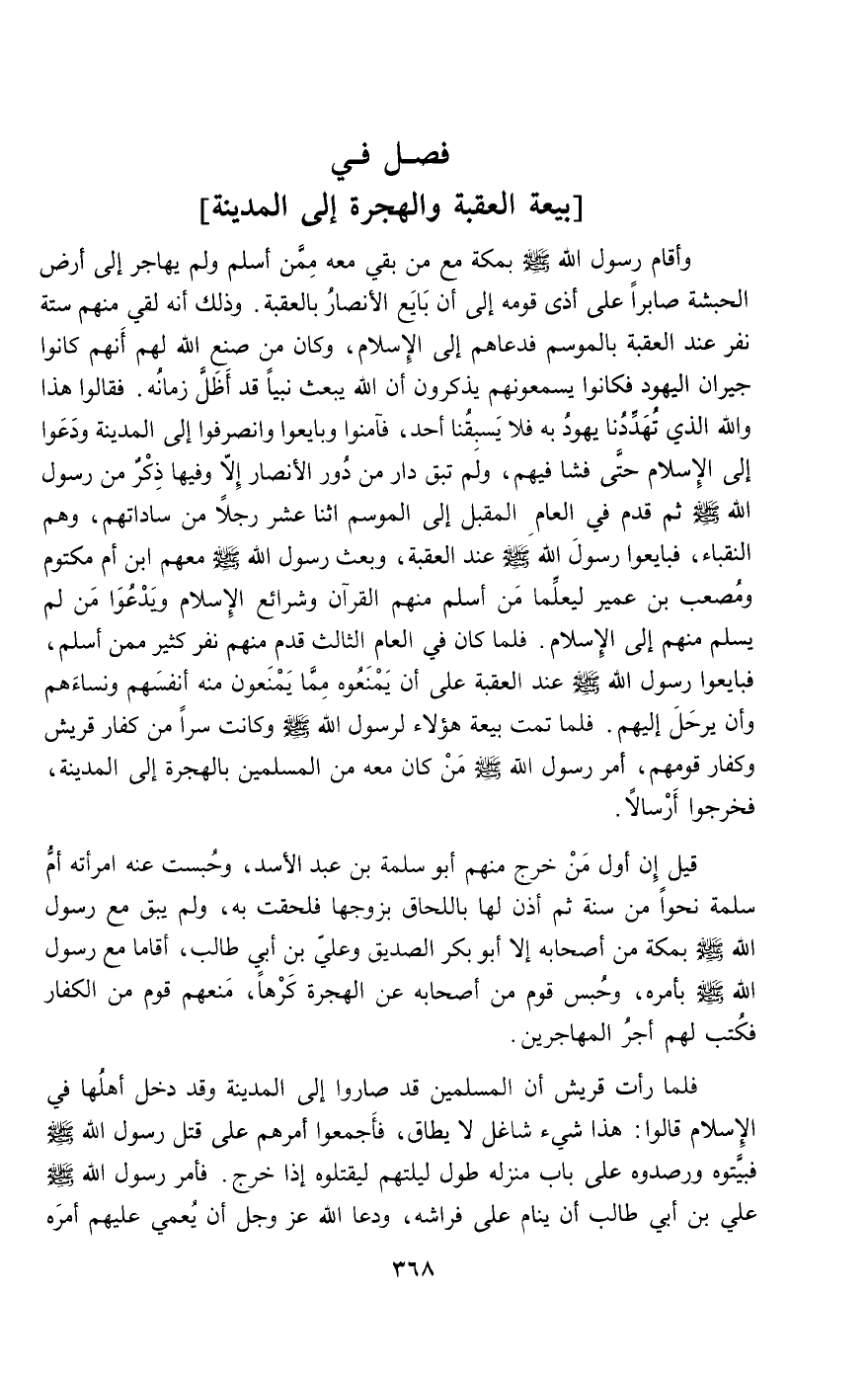 وأقام رسول الله - صَلَّى اللَّهُ عَلَيْهِ وَسَلَّمَ - بمكة مع من بقي معه ممن أسلم ولم يهاجر إلى أرض الحبشة صابرا على أذى قومه إلى أن بايع الأنصار بالعقبة. وذلك أنه لقي منهم ستة نفر عند العقبة بالموسم فدعاهم إلى الإسلام، وكان من صنع الله لهم أنهم كانوا جيران اليهود فكانوا يسمعونهم يذكرون أن الله يبعث نبيا قد أظل زمانه. فقالوا هذا والله الذي تهددنا يهود به فلا يسبقنا أحد، فآمنوا وبايعوا وانصرفوا إلى المدينة ودعوا إلى الإسلام حتى فشا فيهم، ولم تبق دار من دور الأنصار إلا وفيها ذكر من رسول الله - صَلَّى اللَّهُ عَلَيْهِ وَسَلَّمَ - ثم قدم في العام المقبل إلى الموسم اثنا عشر رجلا من ساداتهم، وهم النقباء، فبايعوا رسول الله عند العقبة، وبعث رسول الله - صَلَّى اللَّهُ عَلَيْهِ وَسَلَّمَ - معهم ابن أم مكتوم ومصعب بن عمير ليعلما من أسلم منهم القرآن وشرائع الإسلام ويدعوا من لم يسلم منهم إلى الإسلام. فلما كان في العام الثالث قدم منهم نفر كثير ممن أسلم، فبايعوا رسول الله - صَلَّى اللَّهُ عَلَيْهِ وَسَلَّمَ - عند العقبة على أن يمنعوه مما يمنعون منه أنفسهم ونساءهم وأن يرحل إليهم. فلما تمت بيعة هؤلاء لرسول الله - صَلَّى اللَّهُ عَلَيْهِ وَسَلَّمَ - وكانت سرا من كفار قريش وكفار قومهم، أمر رسول الله - صَلَّى اللَّهُ عَلَيْهِ وَسَلَّمَ - من كان معه من المسلمين بالهجرة إلى المدينة، فخرجوا أرسالا.