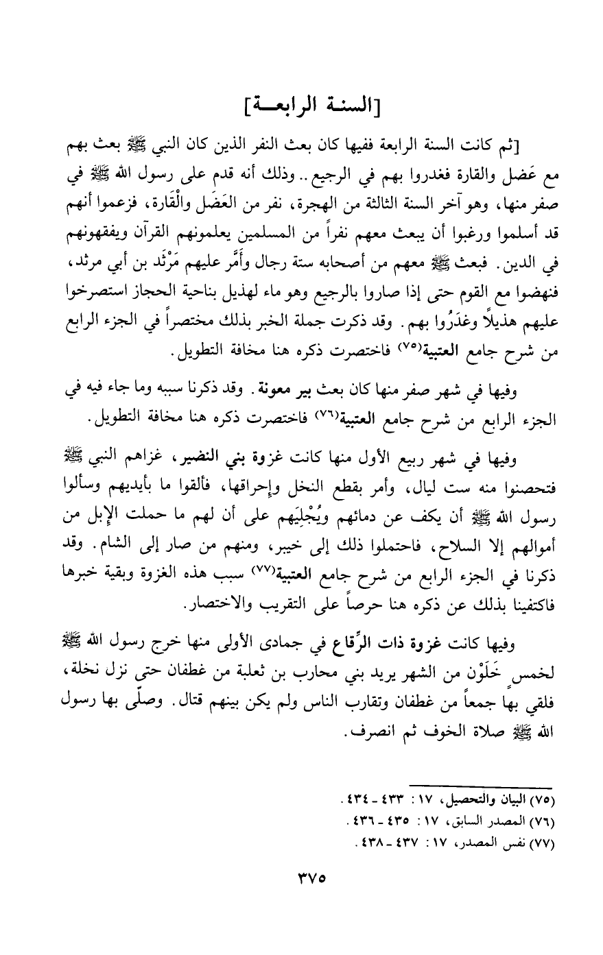 أثم كانت السنة الرابعة ففيها كان بعث النفر الذين كان النبي - صَلَّى اللَّهُ عَلَيْهِ وَسَلَّمَ - بعث بهم مع عضل والقارة فغدروا بهم في الرجيع .. وذلك أنه قدم على رسول الله - صَلَّى اللَّهُ عَلَيْهِ وَسَلَّمَ - في صفر منها، وهو آخر السنة الثالثة من الهجرة، نفر من العضل والقارة، فزعموا أنهم قد أسلموا ورغبوا أن يبعث معهم نفرا من المسلمين يعلمونهم القرآن ويفقهونهم في الدين. فبعث - صَلَّى اللَّهُ عَلَيْهِ وَسَلَّمَ - معهم من أصحابه ستة رجال وأمر عليهم مرثد بن أبي مرثد، فنهضوا مع القوم حتى إذا صاروا بالرجيع وهو ماء لهذيل بناحية الحجاز استصرخوا عليهم هذيلا وغدروا بهم. وقد ذكرت جملة الخبر بذلك مختصرا في الجزء الرابع من شرح جامع العتبية فاختصرت ذكره هنا مخافة التطويل.