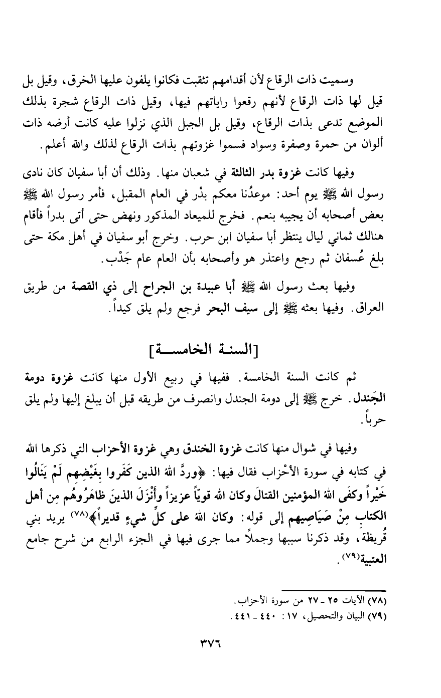 وفيها في شوال منها كانت غزوة الخندق وهي غزوة الأحزاب التي ذكرها الله في كتابه في سورة الأحزاب فقال فيها: {وَرَدَّ اللَّهُ الَّذِينَ كَفَرُوا بِغَيْظِهِمْ لَمْ يَنَالُوا خَيْرًا وَكَفَى اللَّهُ الْمُؤْمِنِينَ الْقِتَالَ وَكَانَ اللَّهُ قَوِيًّا عَزِيزًا - وَأَنْزَلَ الَّذِينَ ظَاهَرُوهُمْ مِنْ أَهْلِ الْكِتَابِ مِنْ صَيَاصِيهِمْ} [الأحزاب: 25 - 26] إلى قوله: {وَكَانَ اللَّهُ عَلَى كُلِّ شَيْءٍ قَدِيرًا} [الأحزاب: 27] يريد بني قريظة، وقد ذكرنا سببها وجملا مما جرى فيها في الجزء الرابع من شرح جامع العتبية.