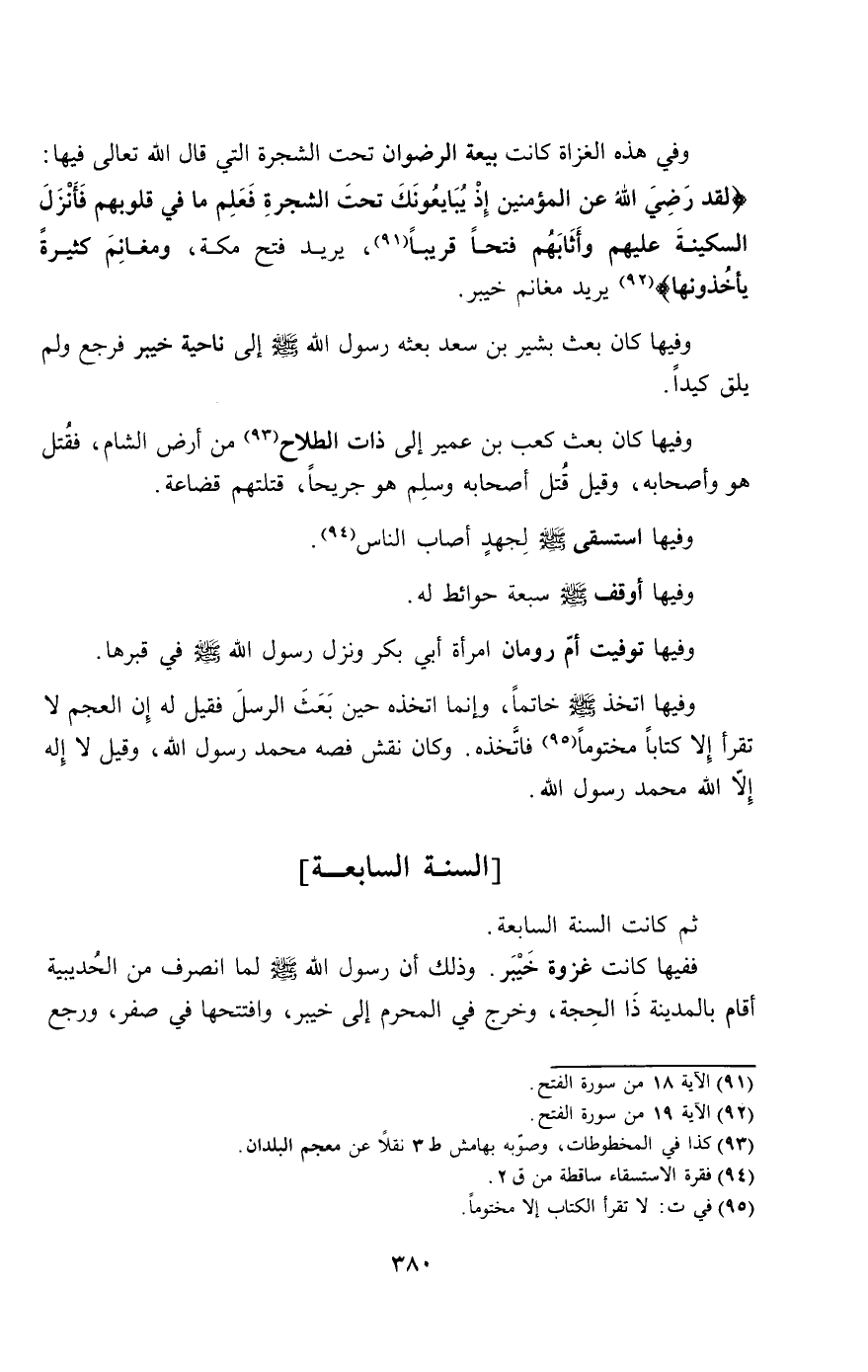 ففيها كانت غزوة خيبر. وذلك أن رسول الله - صَلَّى اللَّهُ عَلَيْهِ وَسَلَّمَ - لما انصرف من الحديبية أقام بالمدينة ذا الحجة، وخرج في المحرم إلى خيبر، وافتتحها في صفر، ورجع