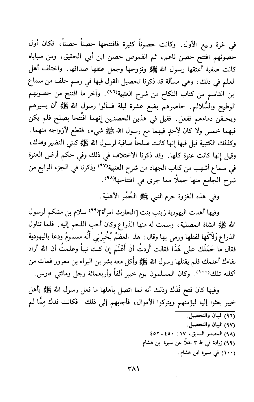في غرة ربيع الأول. وكانت حصونا كثيرة فافتتحها حصنا حصنا، فكان أول حصونهم افتتح حصن ناعم، ثم القموص حصن ابن أبي الحقيق، ومن سباياه كانت «صفية أعتقها رسول الله - صَلَّى اللَّهُ عَلَيْهِ وَسَلَّمَ - وتزوجها وجعل عتقها صداقها». واختلف أهل العلم في ذلك، وهي مسألة قد ذكرنا تحصيل القول فيها في رسم حلف من سماع ابن القاسم من كتاب النكاح من شرح العتبية. وآخر ما افتتح من حصونهم الوطيح والسلالم. حاصرهم بضع عشرة ليلة فسألوا رسول الله - صَلَّى اللَّهُ عَلَيْهِ وَسَلَّمَ - أن يسيرهم ويحقن دمائهم ففعل. فقيل في هذين الحصنين إنهما افتتحا بصلح فلم يكن فيهما خمس ولا كان لأحد فيهما مع رسول الله - صَلَّى اللَّهُ عَلَيْهِ وَسَلَّمَ - شيء، فقطع لأزواجه منهما. وكذلك الكتبية قيل فيها إنها كانت صلحا صافية لرسول الله - صَلَّى اللَّهُ عَلَيْهِ وَسَلَّمَ - كبني النضير وفدك، وقيل إنها كانت عنوة كلها. وقد ذكرنا الاختلاف في ذلك وفي حكم أرض العنوة في سماع أشهب من كتاب الجهاد من شرح العتبية وذكرنا في الجزء الرابع من شرح الجامع منها جملا مما جرى في افتتاحها.