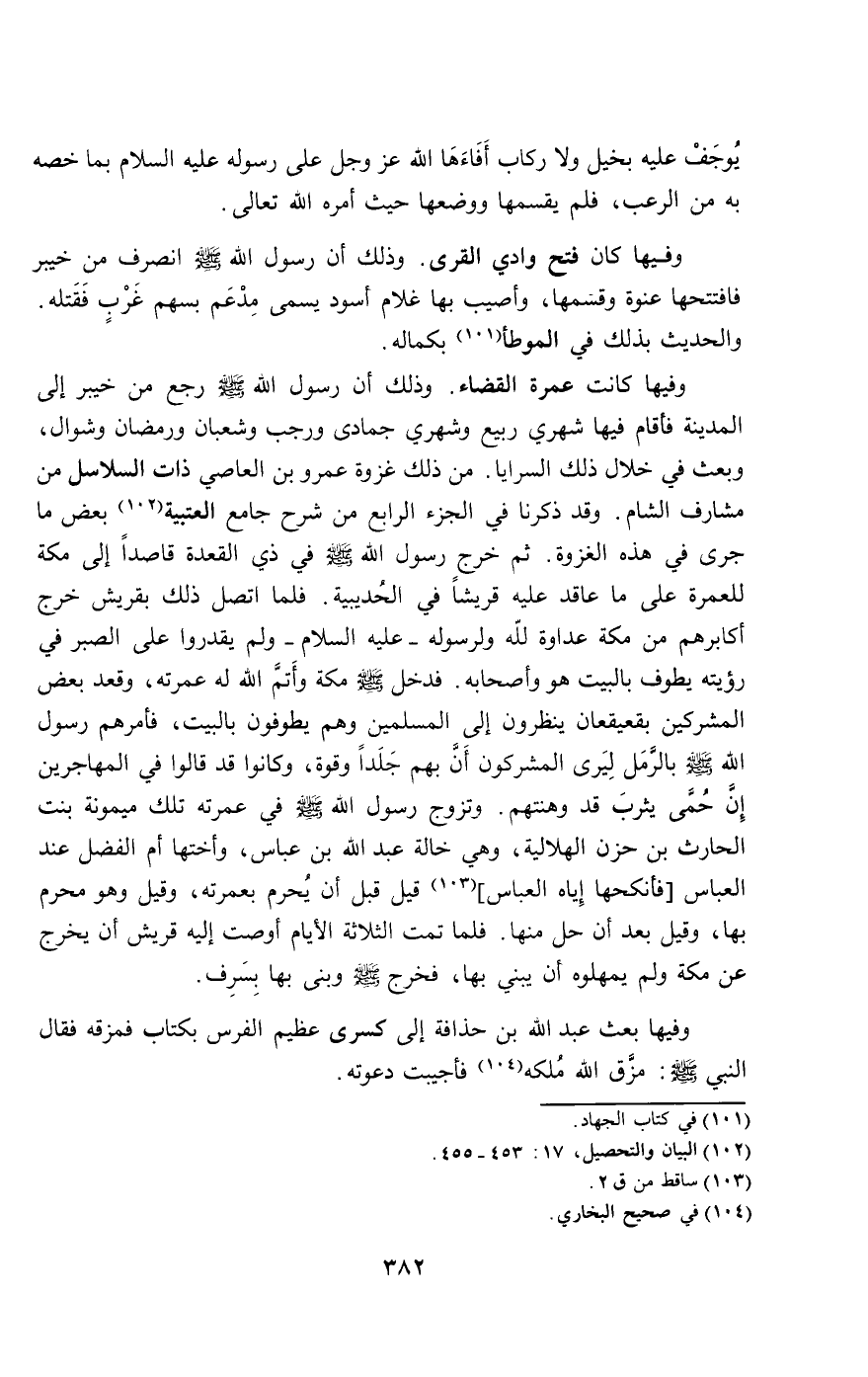 وفيها «بعث عبد الله بن حذافة إلى كسرى عظيم الفرس بكتاب فمزقه فقال النبي - صَلَّى اللَّهُ عَلَيْهِ وَسَلَّمَ -: مزق الله ملكه فأجيبت دعوته».