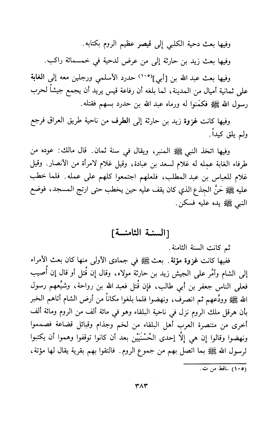 ثم كانت السنة الثامنة. ففيها كانت غزوة مؤتة. بعث - صَلَّى اللَّهُ عَلَيْهِ وَسَلَّمَ - في جمادى الأولى منها كان بعث الأمراء إلى الشام وأمر على الجيش زيد بن حارثة مولاه، وقال إن قتل أو قال إن أصيب فعلى الناس جعفر بن أبي طالب، فإن قتل فعبد الله بن رواحة، وشيعهم رسول الله - صَلَّى اللَّهُ عَلَيْهِ وَسَلَّمَ - وودعهم ثم انصرف، ونهضوا فلما بلغوا مكانا من أرض الشام أتاهم الخبر بأن هرقل ملك الروم نزل في ناحية البلقاء وهو في مائة ألف من الروم ومائة ألف أخرى من متنصرة العرب أهل البلقاء من لخم وجذام وقبائل قضاعة فصمموا ونهضوا وقالوا إن هي إلا إحدى الحسنيين بعد أن كانوا توقفوا وهموا أن يكتبوا لرسول الله - صَلَّى اللَّهُ عَلَيْهِ وَسَلَّمَ - بما اتصل بهم من جموع الروم. فالتقوا بهم بقرية يقال لها مؤتة،