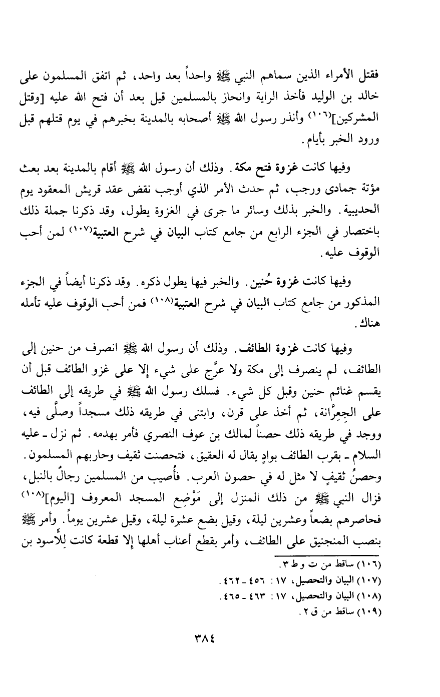 وفيها كانت غزوة حنين. والخبر فيها يطول ذكره. وقد ذكرنا أيضا في الجزء المذكور من جامع كتاب البيان في شرح العتبية فمن أحب الوقوف عليه تأمله هناك.