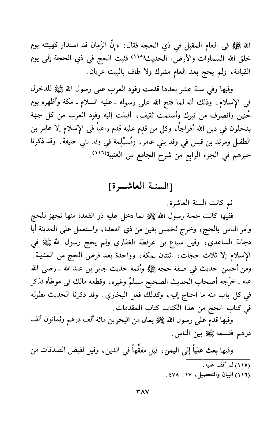 ثم كانت السنة العاشرة. ففيها كانت حجة رسول الله - صَلَّى اللَّهُ عَلَيْهِ وَسَلَّمَ - لما دخل عليه ذو القعدة منها تجهز للحج وأمر الناس بالحج، وخرج لخمس بقين من ذي القعدة، واستعمل على المدينة أبا دجانة الساعدي، وقيل: سباع بن عرفطة الغفاري ولم يحج رسول الله - صَلَّى اللَّهُ عَلَيْهِ وَسَلَّمَ - في الإسلام إلا ثلاث حجات، اثنتان بمكة، وواحدة بعد فرض الحج من المدينة. ومن أحسن حديث في صفة حجه - صَلَّى اللَّهُ عَلَيْهِ وَسَلَّمَ - وأتمه حديث جابر بن عبد الله - رَضِيَ اللَّهُ عَنْهُ - خرجه أصحاب الحديث الصحيح مسلم وغيره، وقطعه مالك في موطأه فذكر في كل باب منه ما احتاج إليه، وكذلك فعل البخاري. وقد ذكرنا الحديث بطوله في كتاب الحج من هذا الكتاب كتاب المقدمات.