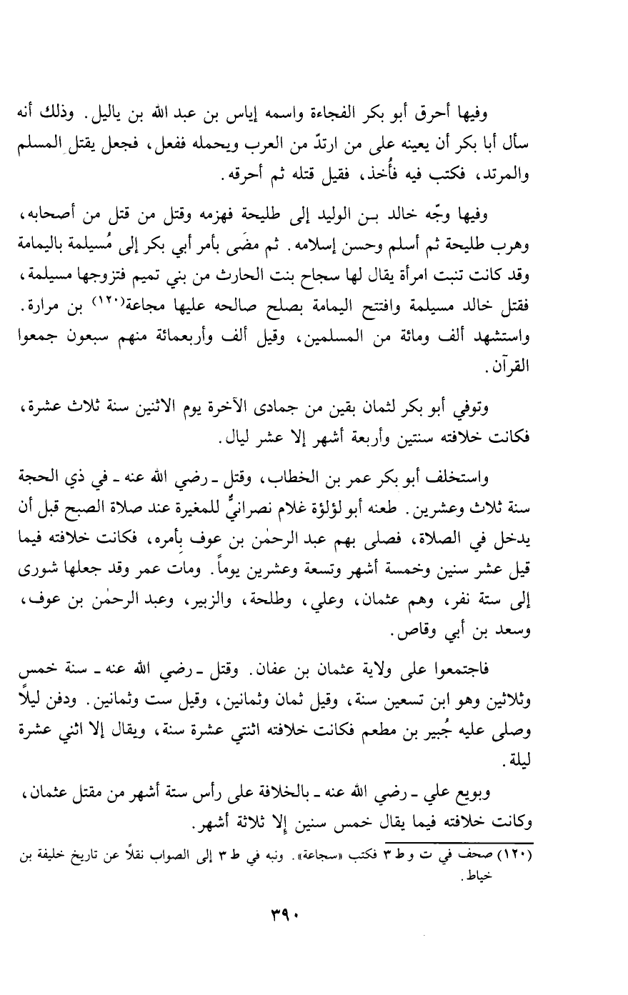 واستخلف أبو بكر عمر بن الخطاب، وقتل - رَضِيَ اللَّهُ عَنْهُ - في ذي الحجة سنة ثلاث وعشرين. طعنه أبو لؤلؤة غلام نصراني للمغيرة عند صلاة الصبح قبل أن يدخل في الصلاة، فصلى بهم عبد الرحمن بن عوف بأمره، فكانت خلافته فيما قيل: عشر سنين وخمسة أشهر وتسعة وعشرين يوما. ومات عمر وقد جعلها شورى إلى ستة نفر، وهم عثمان، وعلي، وطلحة، والزبير، وعبد الرحمن بن عوف، وسعد بن أبي وقاص.