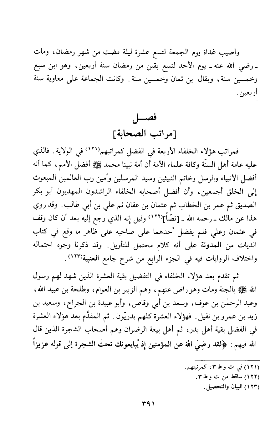 فمراتب هؤلاء الخلفاء الأربعة في الفضل كمراتبهم في الولاية. فالذي عليه عامة أهل السنة وكافة علماء الأمة أن أمة نبينا محمد - صَلَّى اللَّهُ عَلَيْهِ وَسَلَّمَ - أفضل الأمم، كما أنه أفضل الأنبياء والرسل وخاتم النبيين وسيد المرسلين وأمين رب العالمين المبعوث إلى الخلق أجمعين، وأن أفضل أصحابه الخلفاء الراشدون المهديون أبو بكر الصديق، ثم عمر بن الخطاب، ثم عثمان بن عفان، ثم علي بن أبي طالب. وقد روي هذا عن مالك - رَحِمَهُ اللَّهُ - وقيل: إنه الذي رجع إليه بعد أن كان وقف في عثمان وعلي فلم يفضل أحدهما على صاحبه على ظاهر ما وقع في كتاب الديات من المدونة على أنه كلام محتمل للتأويل. وقد ذكرنا وجوه احتماله واختلاف الروايات فيه في الجزء الرابع من شرح جامع العتبية.