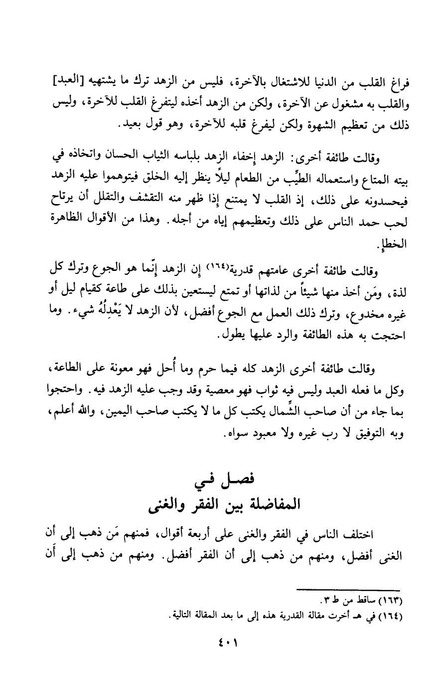 فراغ القلب من الدنيا للاشتغال بالآخرة، فليس من الزهد ترك ما يشتهيه والقلب به مشغول عن الآخرة، ولكن من الزهد أخذه ليتفرغ القلب للآخرة، وليس ذلك من تعظيم الشهوة ولكن ليفرغ قلبه للآخرة، وهو قول بعيد.