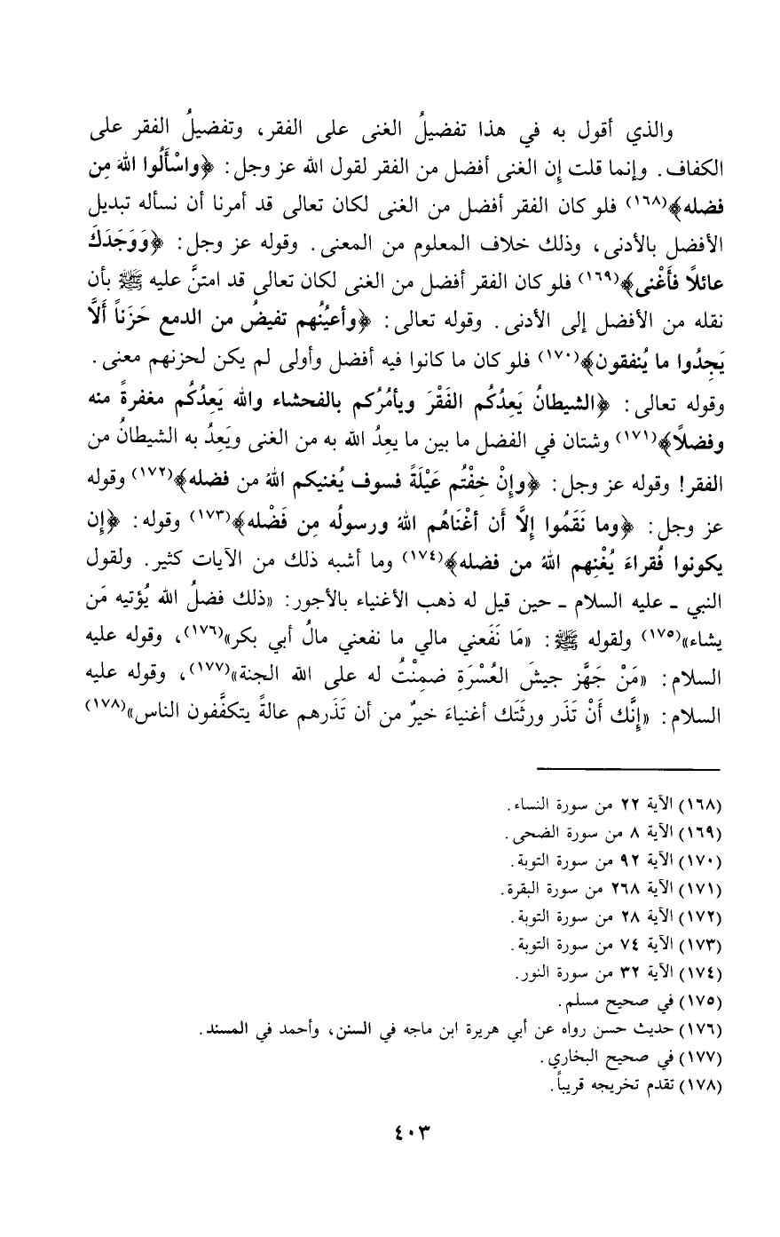 وقَوْله تَعَالَى: {الشَّيْطَانُ يَعِدُكُمُ الْفَقْرَ وَيَأْمُرُكُمْ بِالْفَحْشَاءِ وَاللَّهُ يَعِدُكُمْ مَغْفِرَةً مِنْهُ وَفَضْلا} [البقرة: 268] وشتان في الفضل ما بين ما يعد الله به من الغنى، ويعد به الشيطان من الفقر! وقوله عز وجل: {وَإِنْ خِفْتُمْ عَيْلَةً فَسَوْفَ يُغْنِيكُمُ اللَّهُ مِنْ فَضْلِهِ} [التوبة: 28] وقوله عز وجل: {وَمَا نَقَمُوا إِلا أَنْ أَغْنَاهُمُ اللَّهُ وَرَسُولُهُ مِنْ فَضْلِهِ} [التوبة: 74] وقوله: {إِنْ يَكُونُوا فُقَرَاءَ يُغْنِهِمُ اللَّهُ مِنْ فَضْلِهِ} [النور: 32] وما أشبه ذلك من الآيات كثير. ولقول «النبي - عَلَيْهِ السَّلَامُ - حين قيل له: ذهب الأغنياء بالأجور: ذلك فضل الله يؤتيه من يشاء» ولقوله - صَلَّى اللَّهُ عَلَيْهِ وَسَلَّمَ -: «ما نفعني مالي ما نفعني مال أبي بكر»، وقوله - عَلَيْهِ السَّلَامُ -: «من جهز جيش العسرة ضمنت له على الله الجنة»، وقوله - عَلَيْهِ السَّلَامُ -: «إنك أن تذر ورثتك أغنياء خير من أن تذرهم عالة يتكففون الناس»