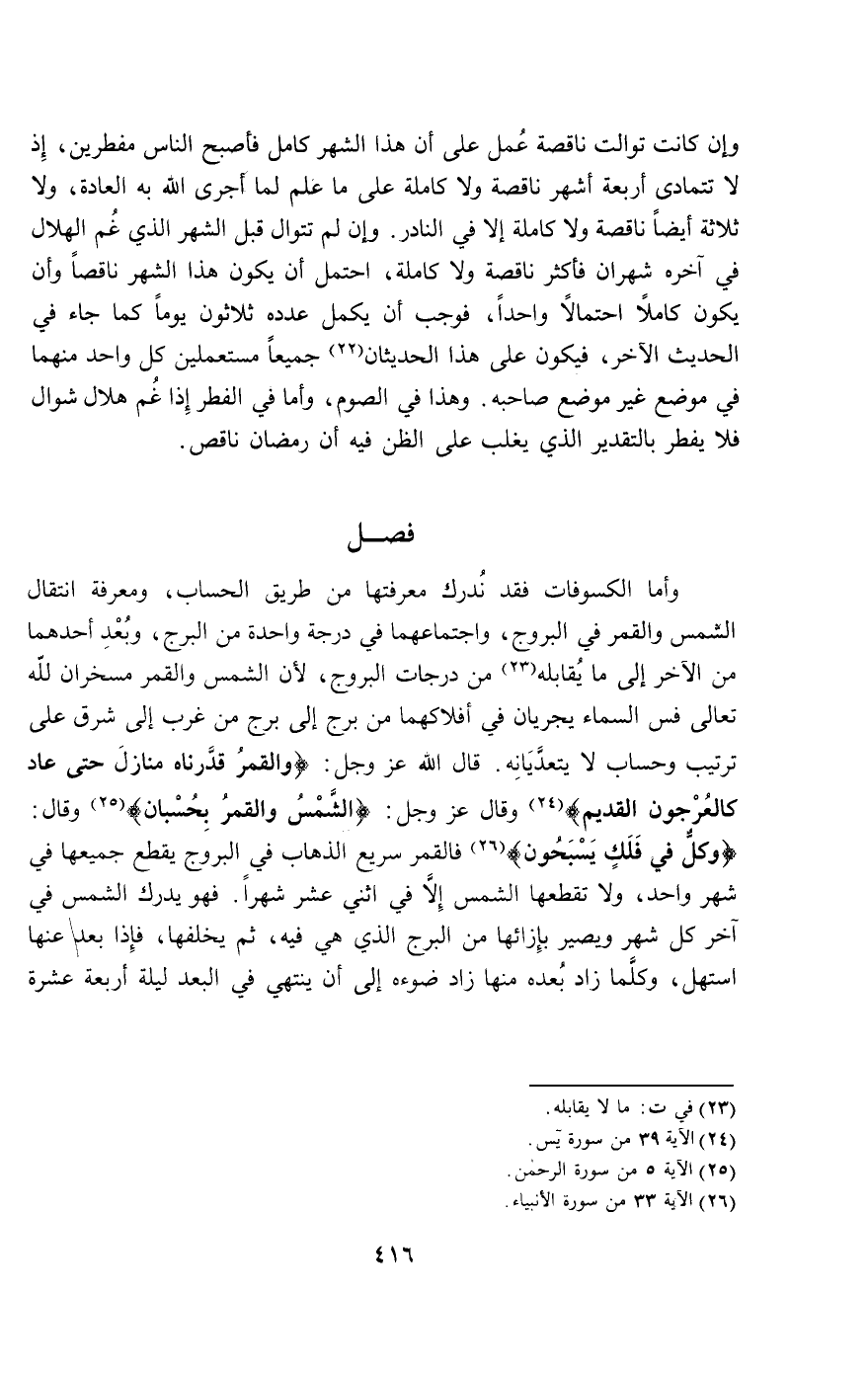 وأما الكسوفات فقد ندرك معرفتها من طريق الحساب، ومعرفة انتقال الشمس والقمر في البروج، واجتماعهما في درجة واحدة من البرج، وبعد أحدهما من الآخر إلى ما يقابله من درجات البروج، لأن الشمس والقمر مسخران لله تعالى في السماء يجريان في أفلاكهما من برج إلى برج من غرب إلى شرق على ترتيب وحساب لا يتعديانه. قال الله عز وجل: {وَالْقَمَرَ قَدَّرْنَاهُ مَنَازِلَ حَتَّى عَادَ كَالْعُرْجُونِ الْقَدِيمِ} [يس: 39] وقال عز وجل: {الشَّمْسُ وَالْقَمَرُ بِحُسْبَانٍ} [الرحمن: 5] وَقَالَ {وَكُلٌّ فِي فَلَكٍ يَسْبَحُونَ} [يس: 40] فالقمر سريع الذهاب في البروج يقطع جميعها في شهر واحد، ولا تقطعها الشمس إلا في اثني عشر شهرا. فهو يدرك الشمس في آخر كل شهر ويصير بإزائها من البرج الذي هي فيه، ثم يخلفها، فإذا بعد عنها استهل، وكلما زاد بعده منها زاد ضوؤه إلى أن ينتهي في البعد ليلة أربعة عشر