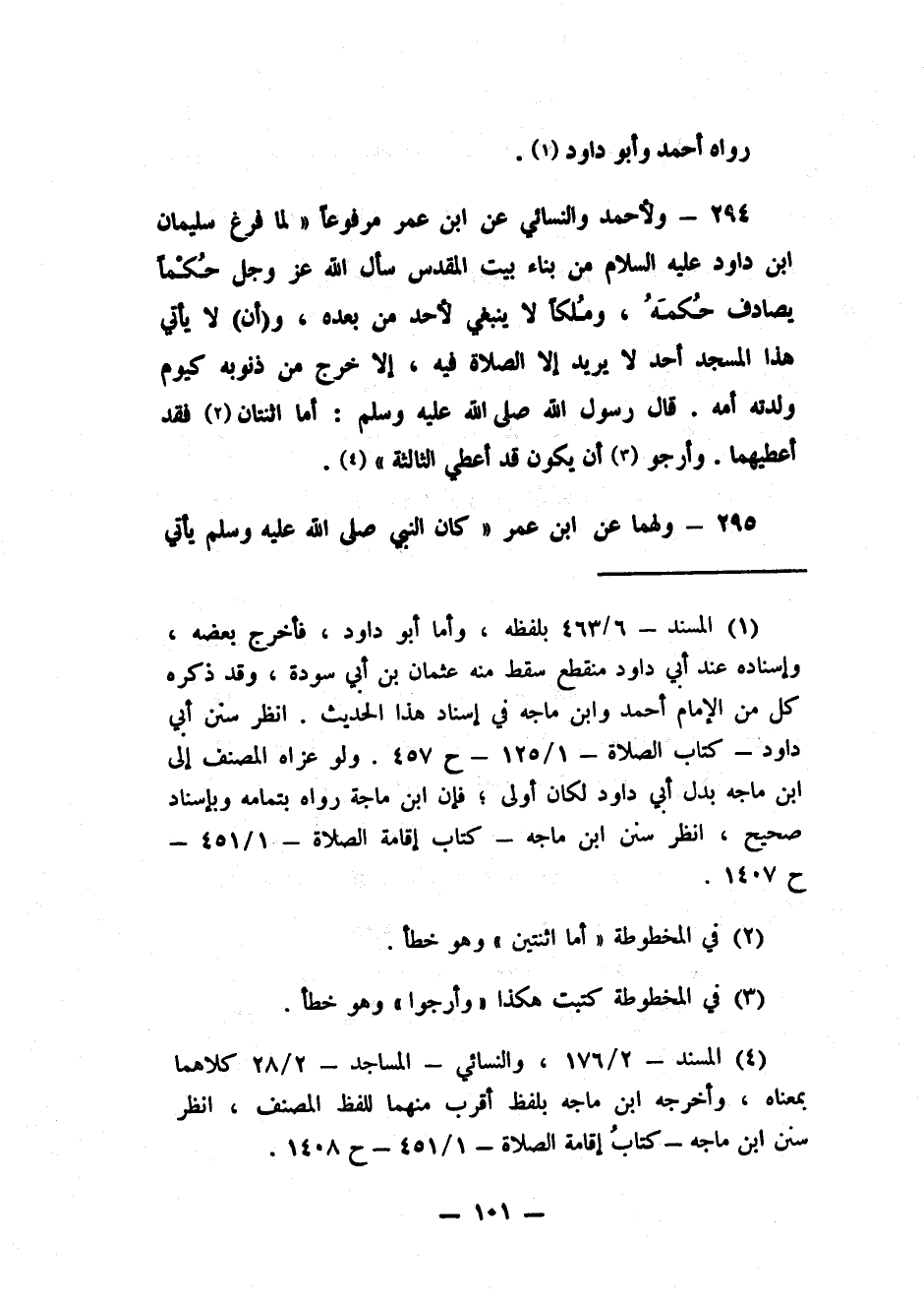294- ولأحمد والنسائي عن ابن عمر مرفوعاً: "لما فرغ سليمان بن داود عليه السلام من بناء بيت المقدس سأل الله عز وجل حُكْماً يصادف حُكْمُهُ، ومُلْكاً لا ينبغي، لأحد من بعده، و (أن) لا يأتي هذا المسجد أحد لا يريد إلا الصلاة فيه، إلا خرج من ذنوبه كيوم ولدته أمه. قال رسول الله صلى الله عليه وسلم: أما اثنتان 2 فقد أُعْطِيَهُما. وأرجو 3 أن يكون قد أُعْطِيَ الثالثة "4.