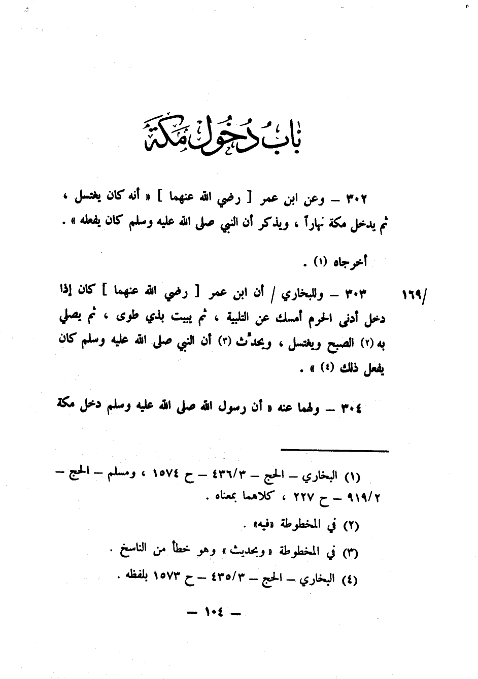 302- وعن ابن عمر [رضي الله عنهما] : "أنه كان يغتسل، ثم يدخل مكة نهاراً، ويذكر أن النبي صلى الله عليه وسلم كان يفعله" أخرجاه 1.