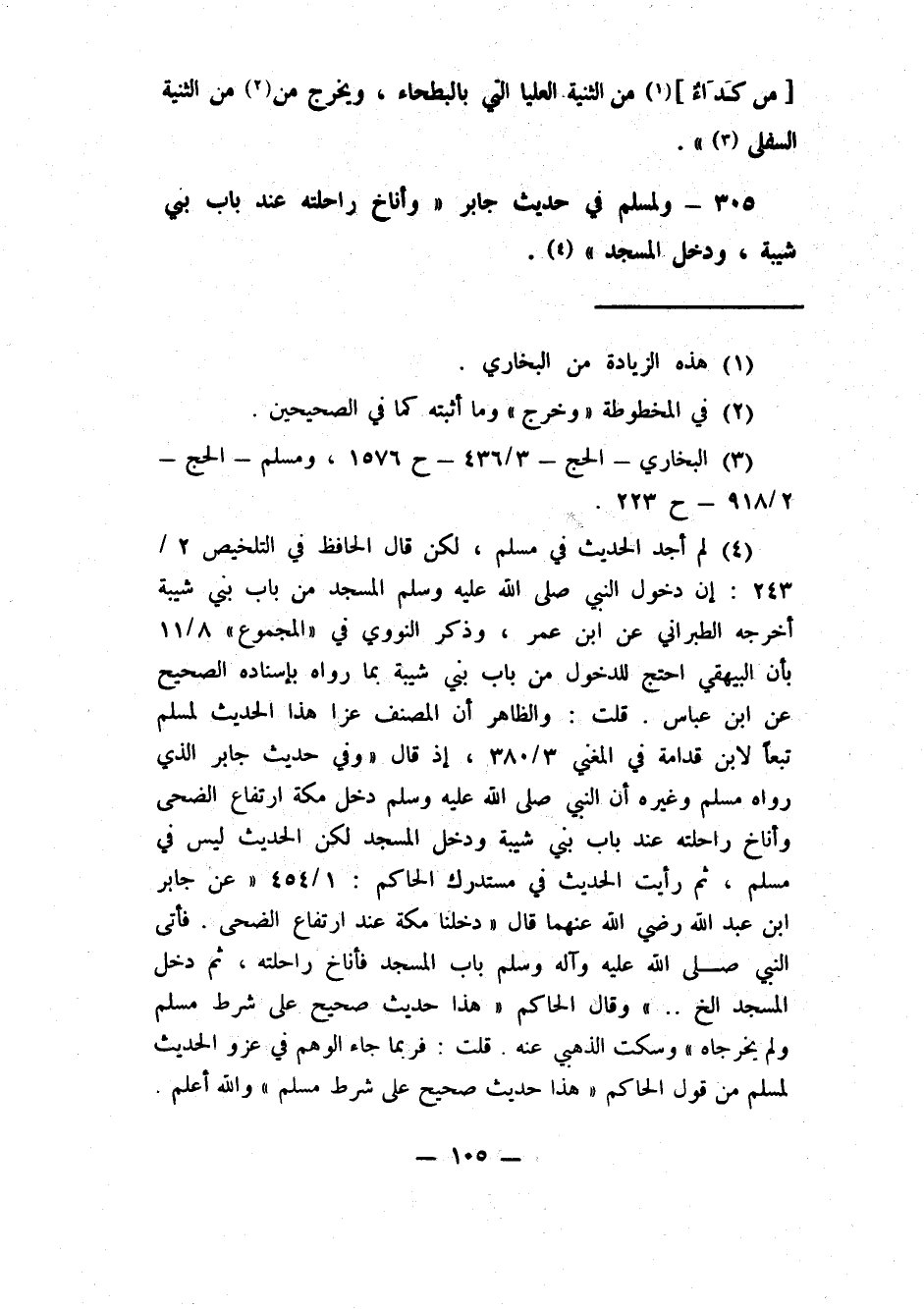 305- ولمسلم في حديث جابر: "وأناخ راحلته عند باب بني شيبة، ودخل المسجد"4.