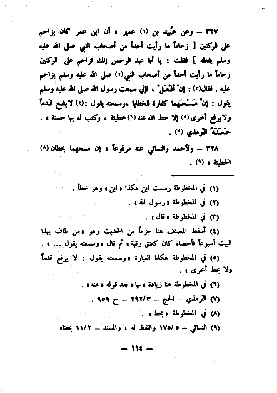 327- وعن عُبَيْد بن1 عمير: "أن ابن عمر كان يزاحم على الركنين [زحاماً ما رأيت أحداً من أصحاب النبي صلى الله عليه وسلم يفعله] فقلت: يا أبا عبد الرحمن إنك تزاحم على الركنين زحاماً ما رأيت أحداً من أصحاب النبي2 صلى الله عليه وسلم يزاحم عليه. فقال:3 إِنْ أَفْعَلْ، فإني سمعت رسول الله صلى الله عليه وسلم يقول: إِنَّ مَسْحَهُمَا كفارة للخطايا، وسمعته يقول:4 لا يضع قَدَماً ولا يرفع أخرى5 إلا حط الله عنه6 خطيئة، وكتب له بها حسنة " حَسَّنَهُ الترمذي 7.