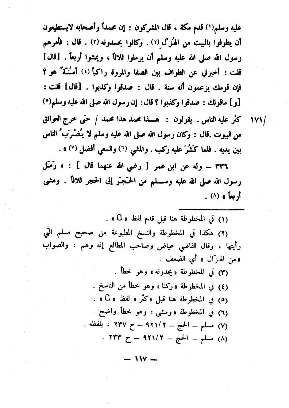 336- وله عن ابن عمر [رضي الله عنهما قال] : "رَمَلَ رسول الله صلى الله عليه وسلم من الْحَجَر إلى الحجر ثلاثاً. ومشى أربعا"4.