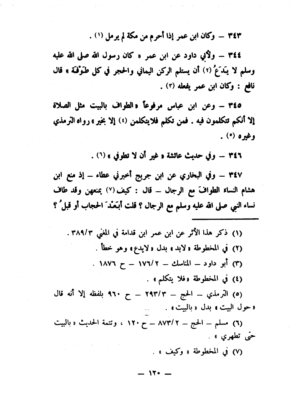 345- وعن ابن عباس مرفوعاً: "الطواف بالبيت مثل الصلاة إلا أنكم تتكلمون فيه، فمن تكلم فلا يتكلمن 4 إلا بخير" رواه الترمذي وغيره 5.