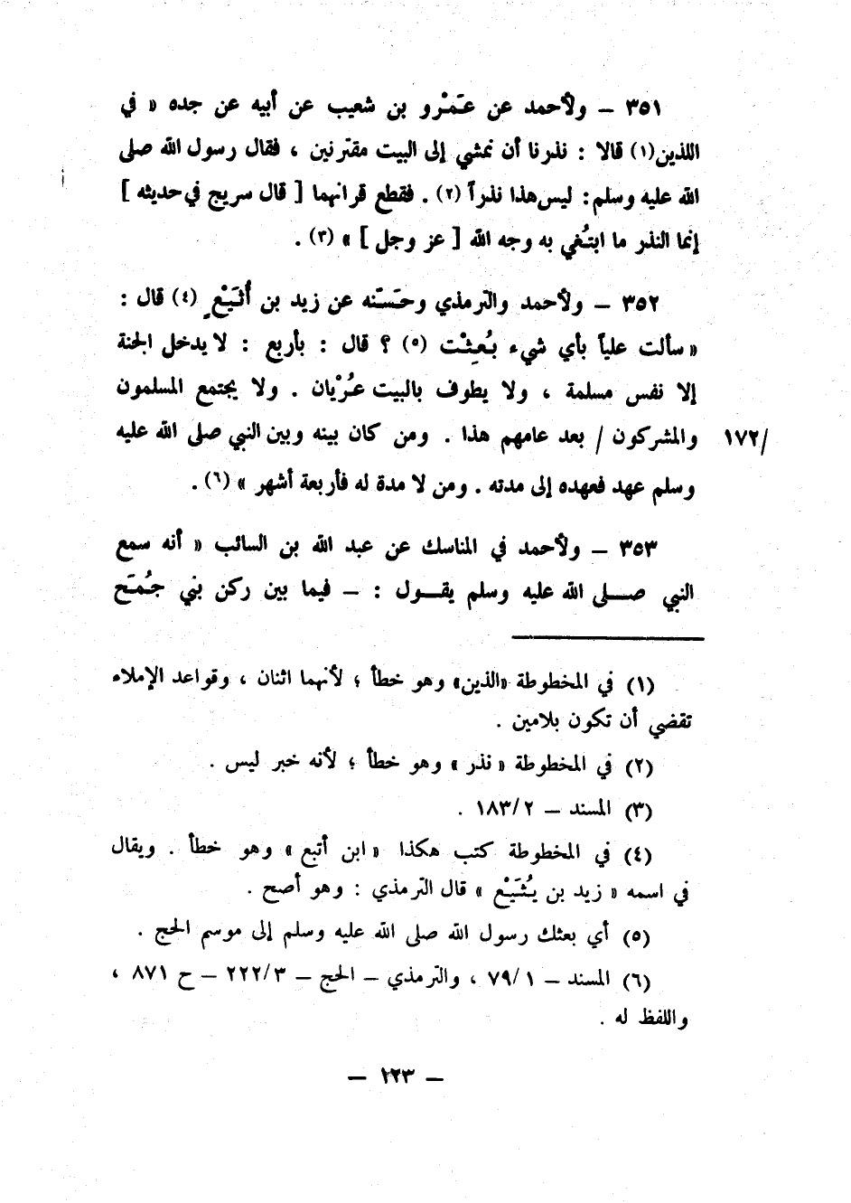 351- ولأحمد عن عَمْرو بن شعيب عن أبيه عن جده في اللذين1 قالا: نذرنا أن نمشي إلى البيت مقترنين، فقال رسول الله صلى الله عليه وسلم ليس هذا نذراً، 2 فقطع قرانهما [قال سريج في حديثه] "إنما النذر ما ابتُغي به وجه الله [عز وجل] "3.