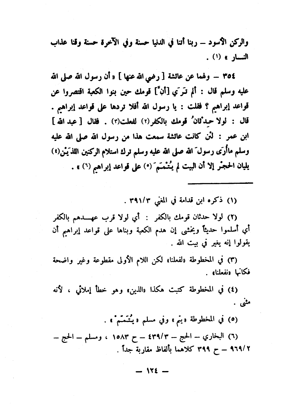 354- ولهما عن عائشة [رضي الله عنها] أن رسول الله صلى الله عليه وسلم قال: "ألم تَرَيْ [أنَّ] قومك حين بنوا الكعبة اقتصروا عن قواعد إبراهيم؟ فقلت: يا رسول الله أفلا تردها على قواعد إبراهيم. قال: لولا حِدْثَانُ قومك بالكفر2 لفعلت3") ، فقال [عبد الله] ابن عمر: لئن كانت عائشة سمعت هذا من رسول الله صلى الله عليه وسلم ما أُرَى رسول الله صلى الله عليه وسلم ترك استلام الركنين اللذَيْن4 يليان الحجْر إلا أن البيت لم يُتْمَمْ5 على قواعد إبراهيم6.