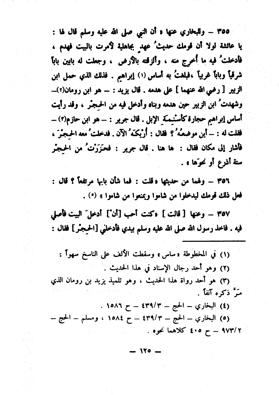 357- وعنها [قالت] : "كنت أحب [أنْ] أدخلَ البيت فأصلي فيه. فأخذ رسول الله صلى الله عليه وسلم بيدي فأدخلني [الحجر] فقال: